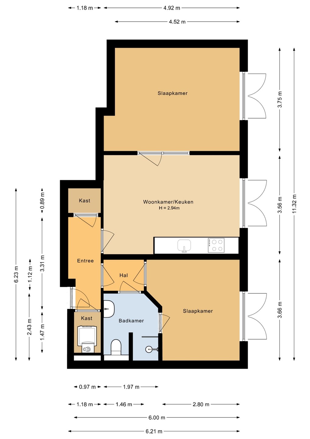 Via de entree komt u in de hal, welke toegang geeft tot de verschillende vertrekken van het appartement. Vanuit de hal bereikt u de woonkamer met open keuken, twee slaapkamers en de badkamer. De lichte woonkamer met open keuken vormt het hart van de woning en biedt voldoende ruimte voor zowel een zit- als eethoek. De keuken is praktisch opgesteld en voorzien van de benodigde aansluitingen.