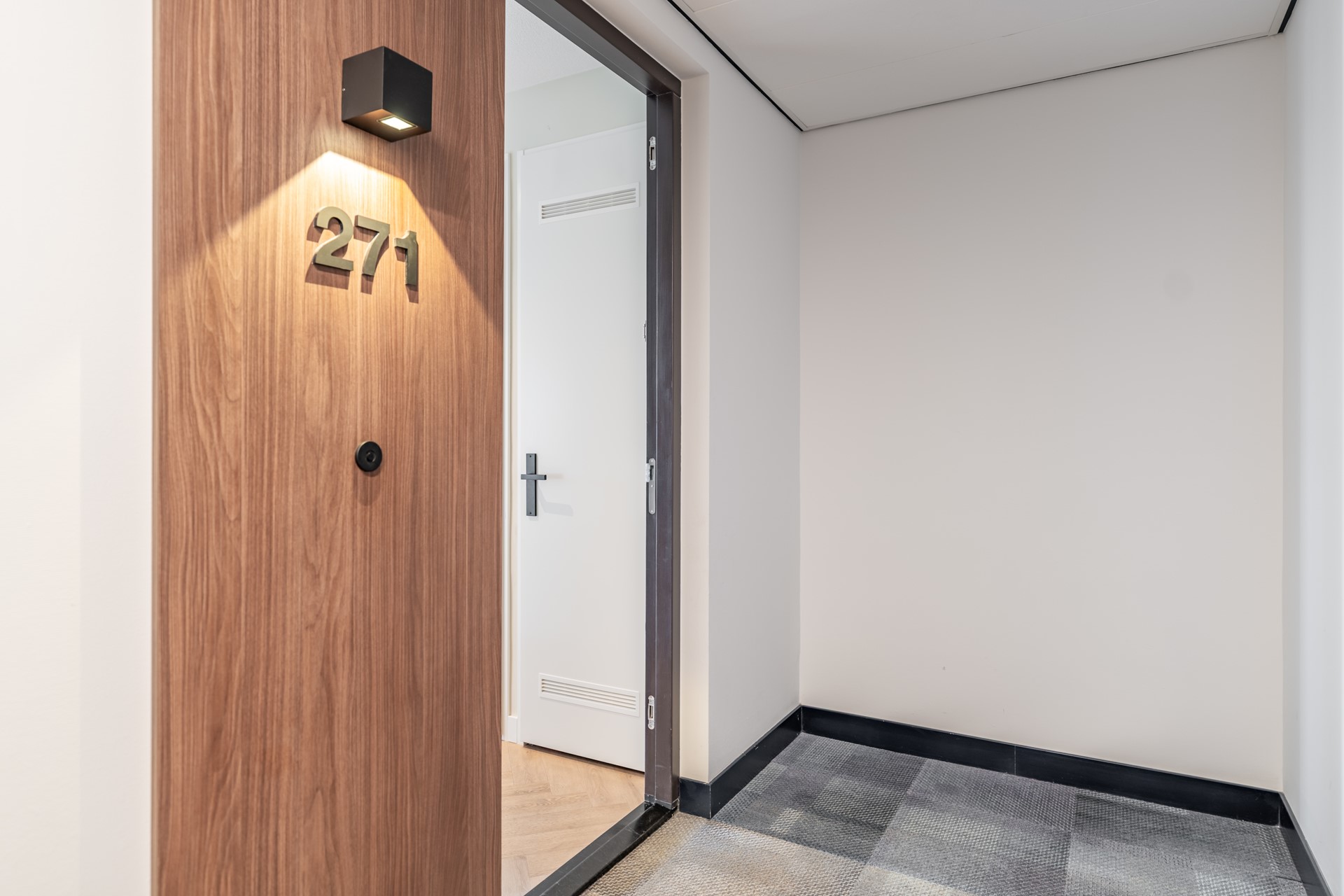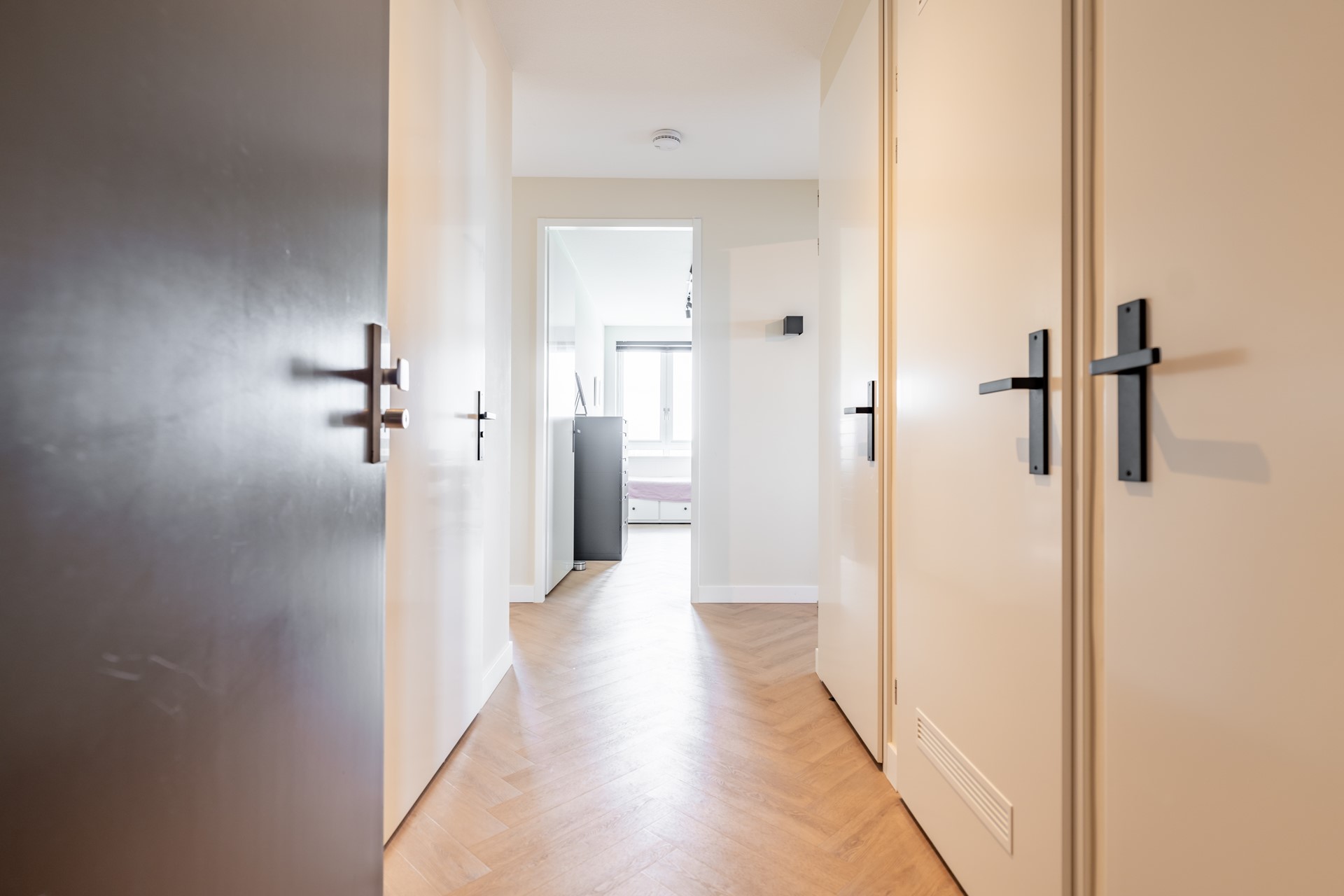 De entree van het complex straalt direct allure uit: een stijlvolle centrale hal met lift brengt u naar de twaalfde verdieping, waar de woning zich opent met een royale ontvangsthal. Hier bevinden zich een ingebouwde garderobe, separaat toilet en de technische ruimte met de moderne warmtepompinstallatie.