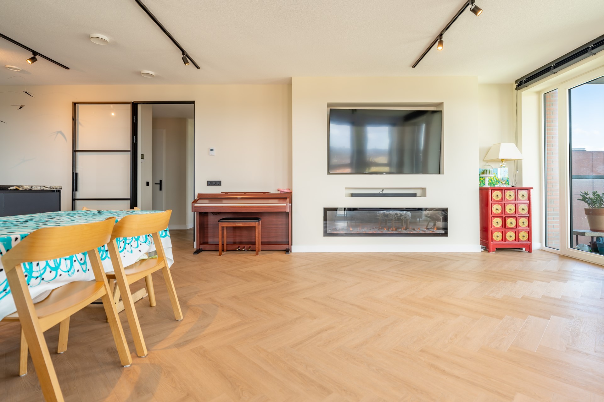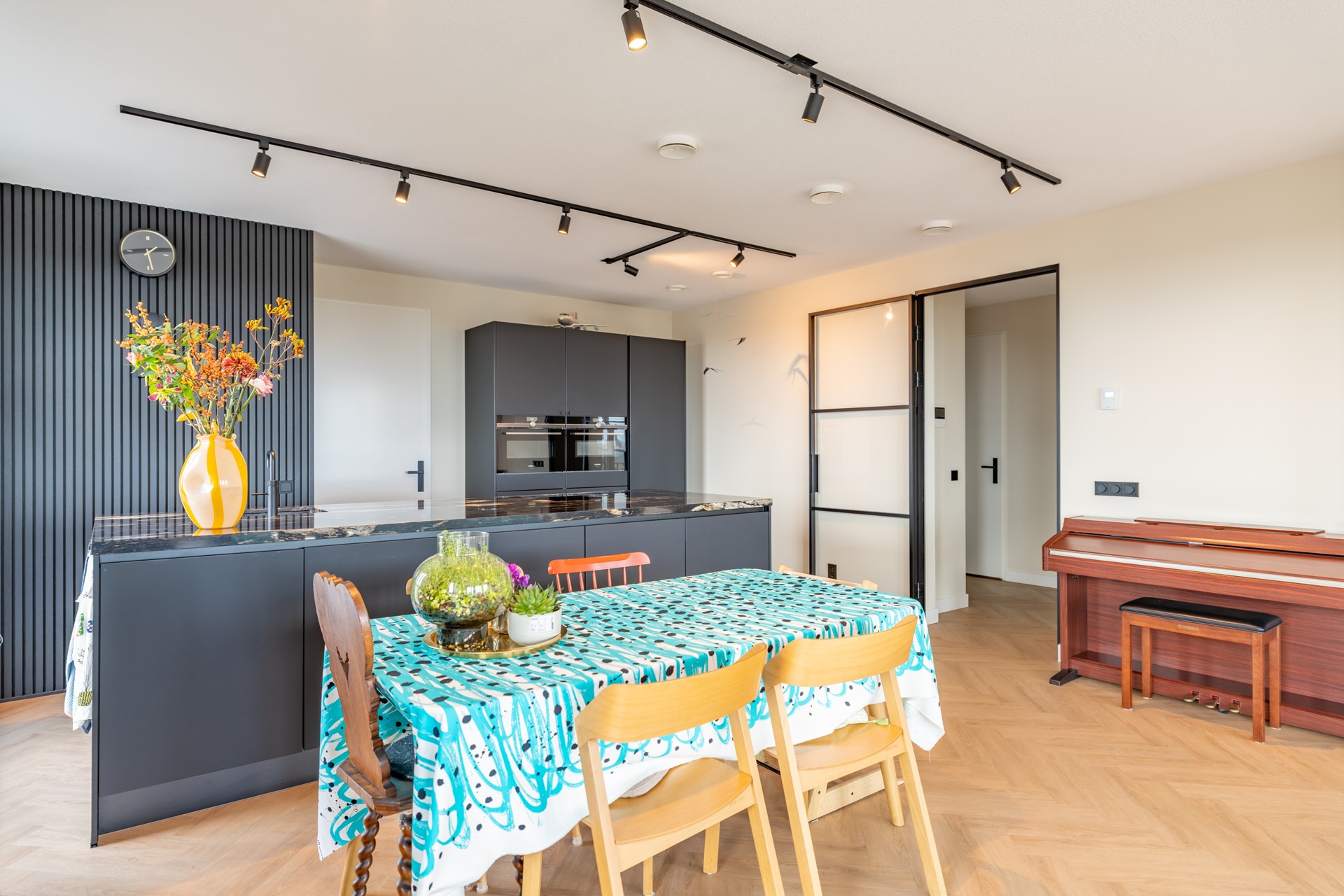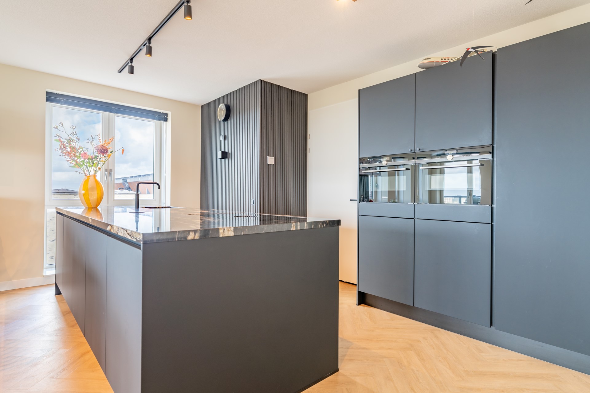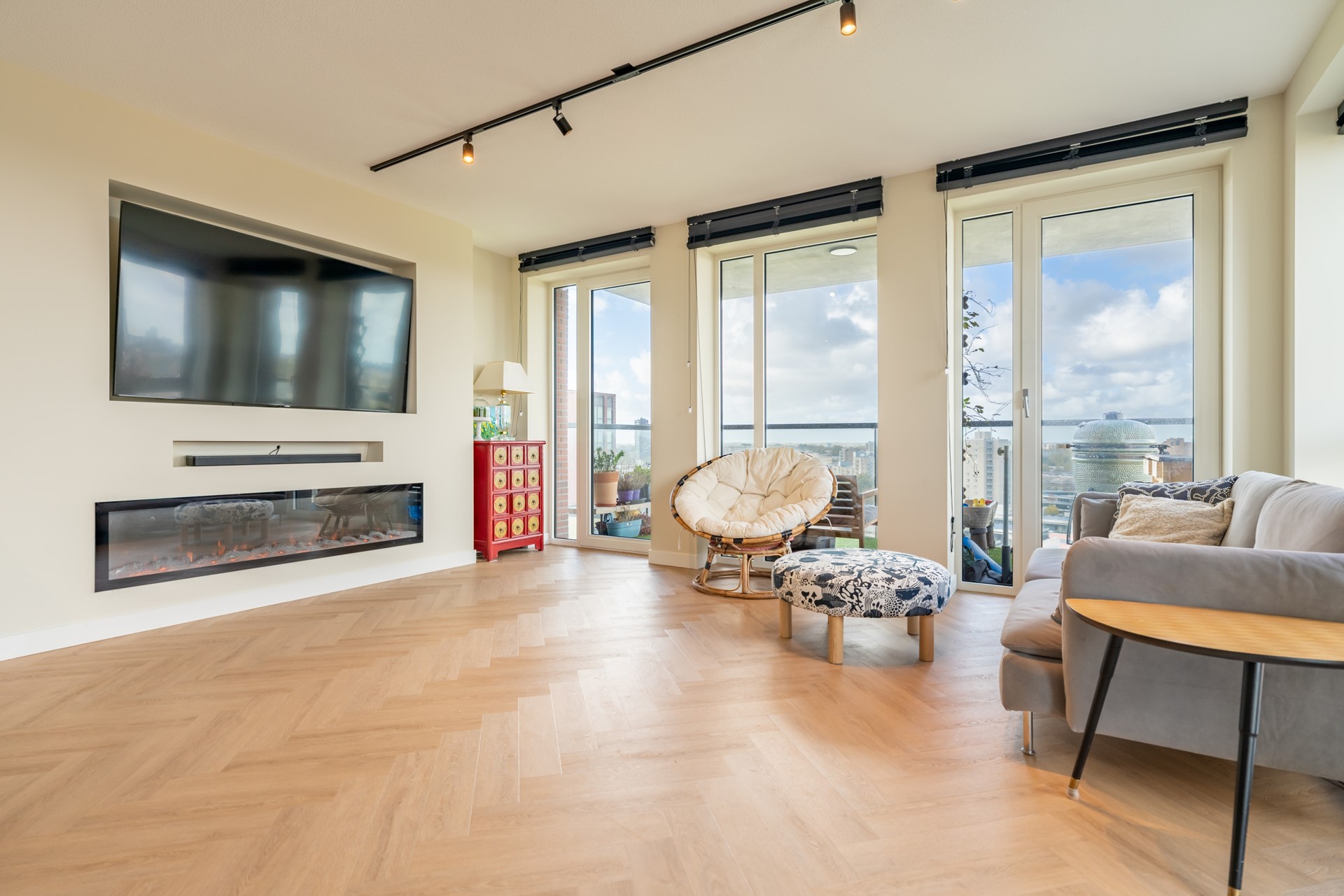 De riante woonkamer is een waar pronkstuk, met grote raampartijen die zorgen voor een overvloed aan licht en een spectaculair uitzicht over Leiden. De sfeervolle cinewall met ingebouwde haard en de hoogwaardige afwerking creëren een luxueuze ambiance. Vanuit de woonkamer is er toegang tot het ruime balkon van circa 12 m², gelegen op het westen — een heerlijke plek om te genieten van de middag- en avondzon. In de zomer kun je hier nog lang genieten van de ondergaande zon.