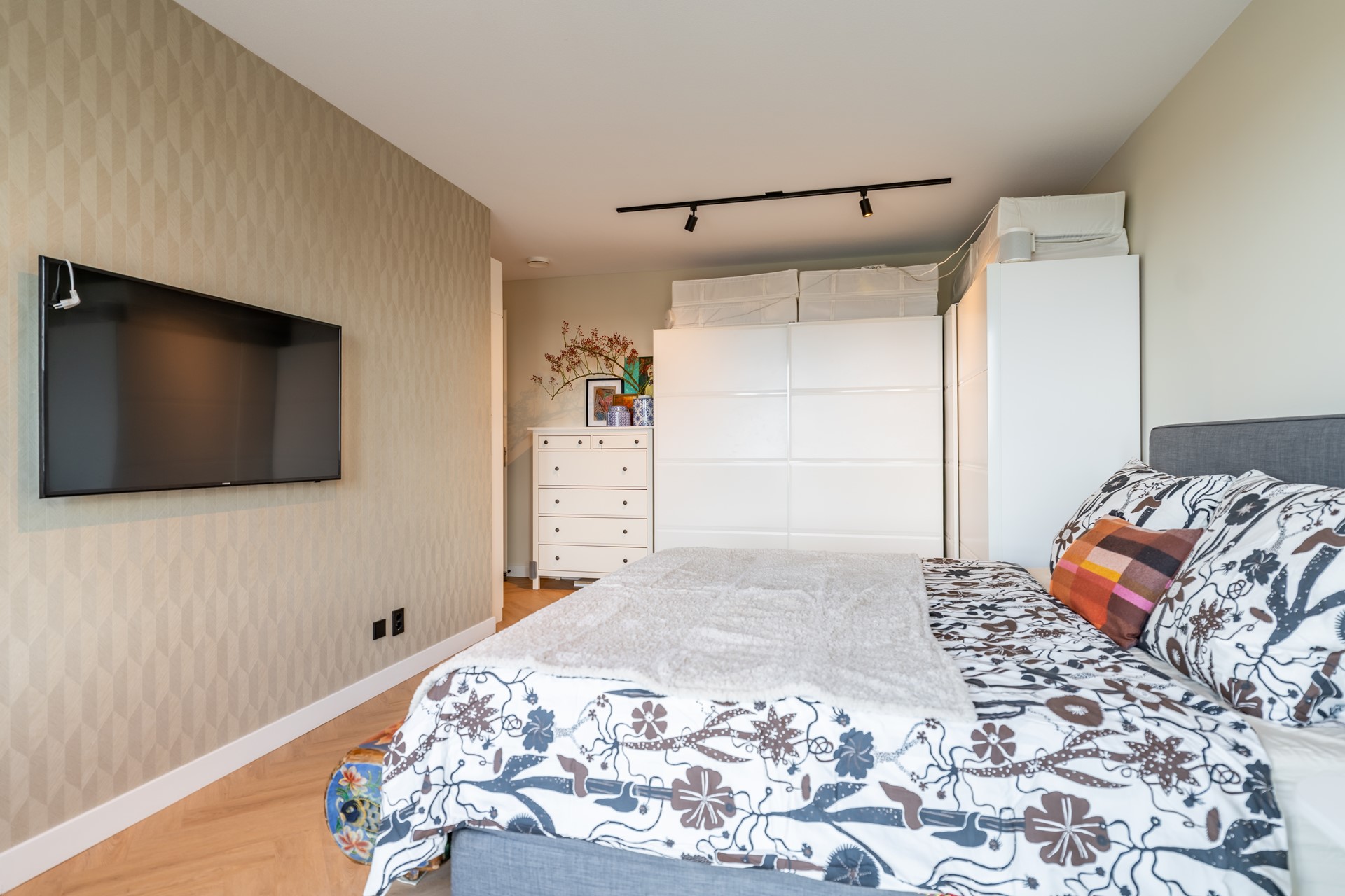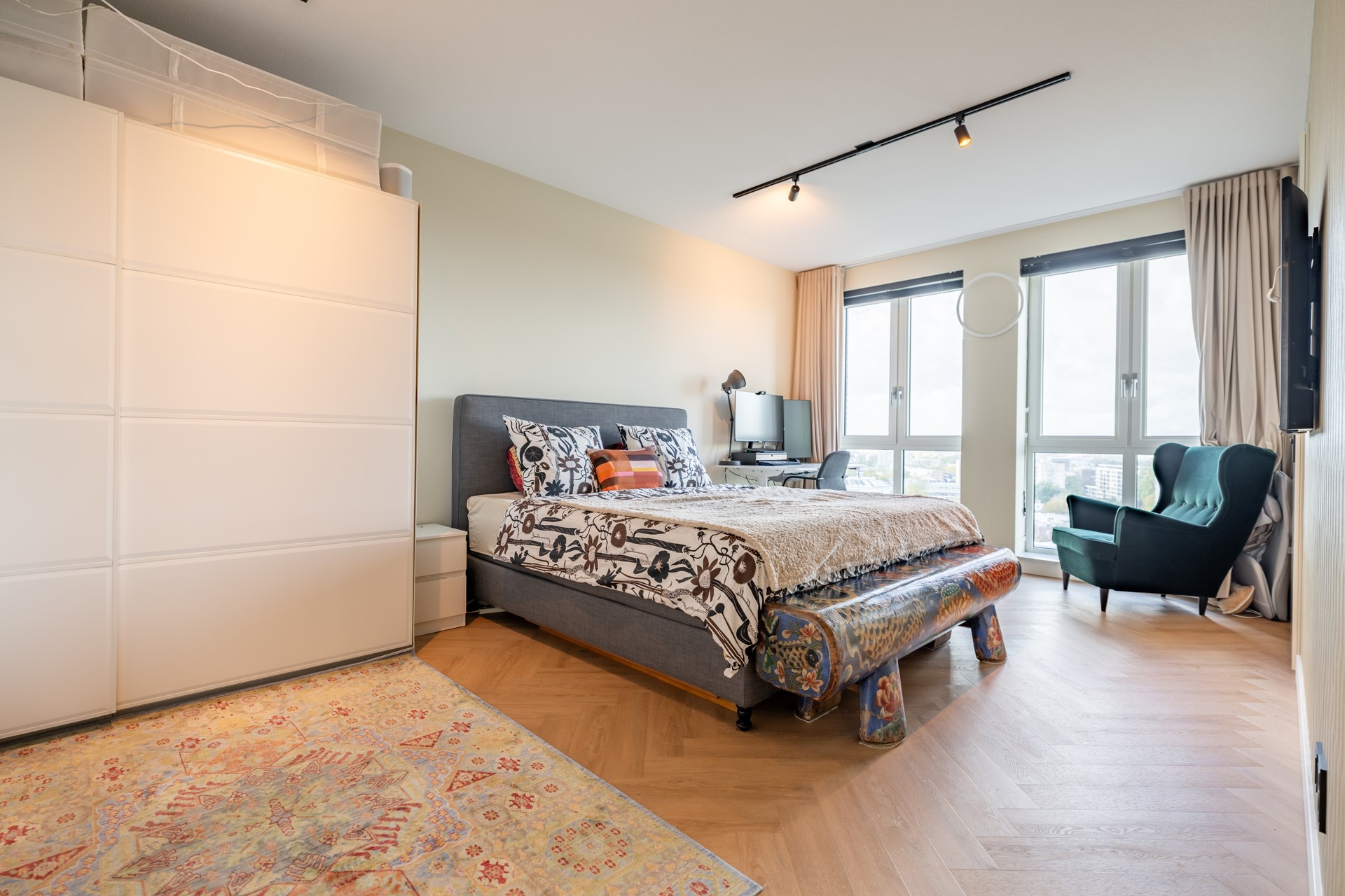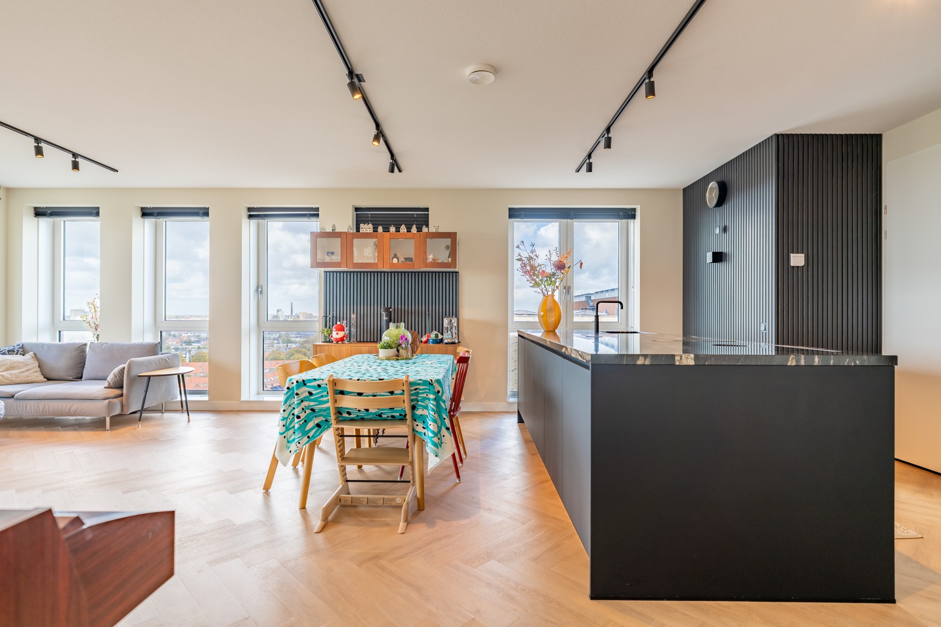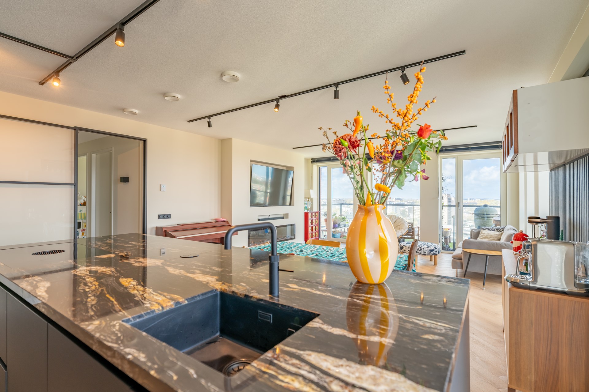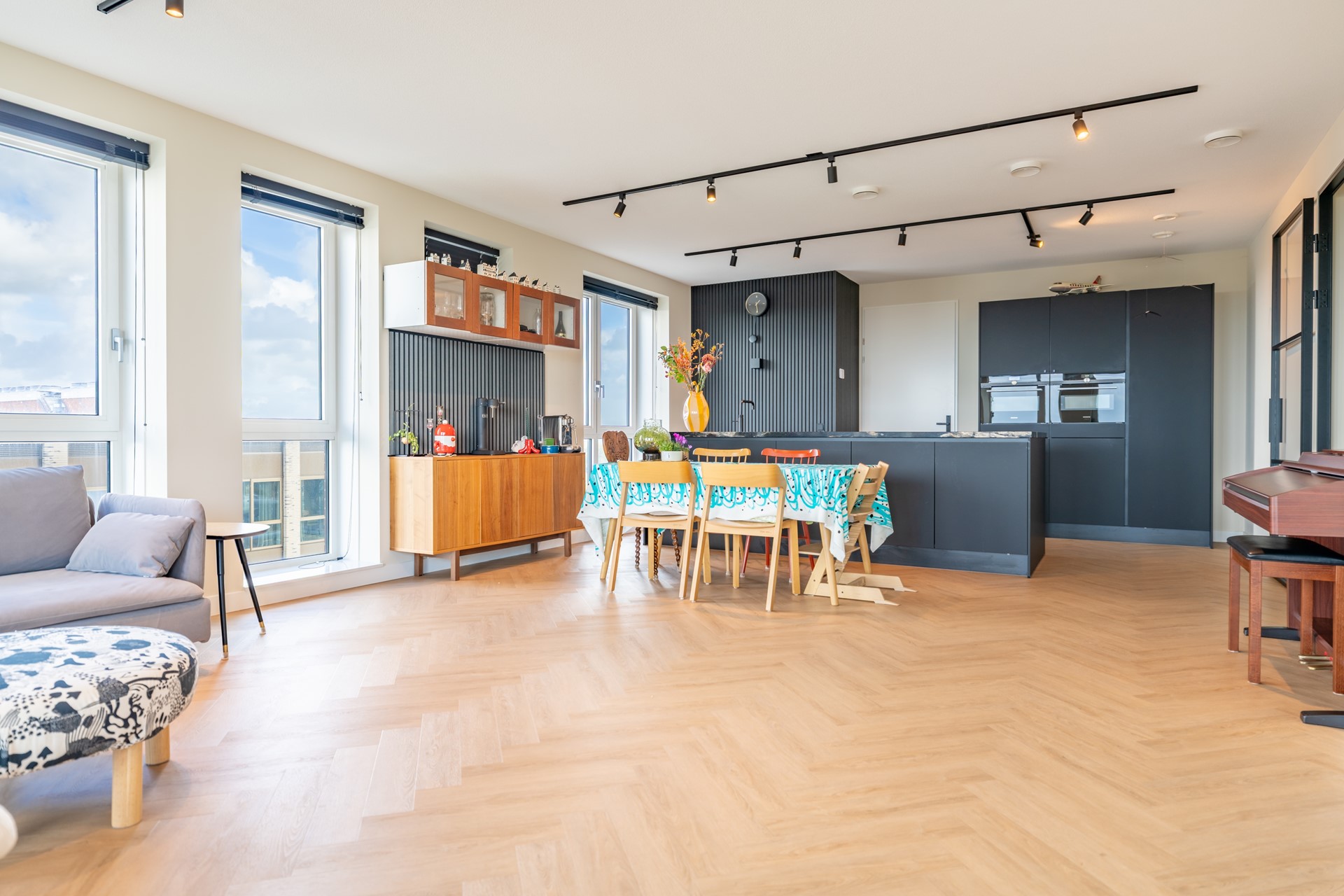 De riante woonkamer is een waar pronkstuk, met grote raampartijen die zorgen voor een overvloed aan licht en een spectaculair uitzicht over Leiden. De sfeervolle cinewall met ingebouwde haard en de hoogwaardige afwerking creëren een luxueuze ambiance. Vanuit de woonkamer is er toegang tot het ruime balkon van circa 12 m², gelegen op het westen — een heerlijke plek om te genieten van de middag- en avondzon. In de zomer kun je hier nog lang genieten van de ondergaande zon.
