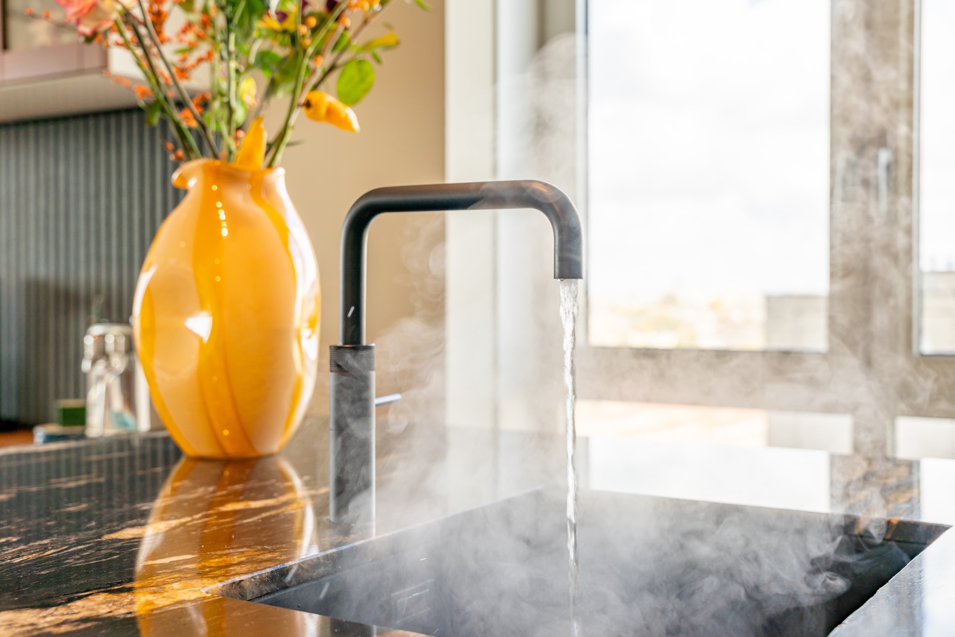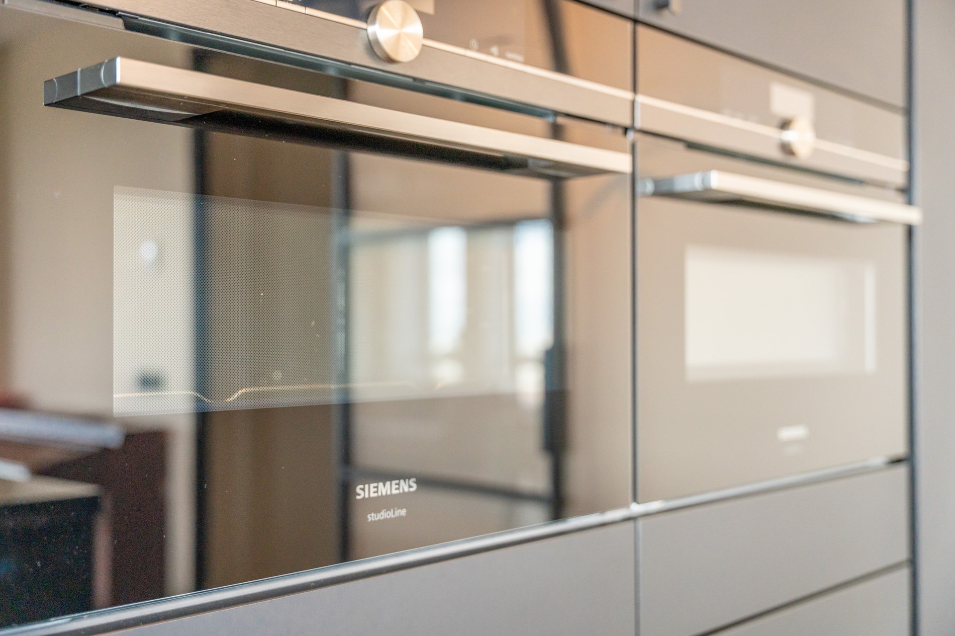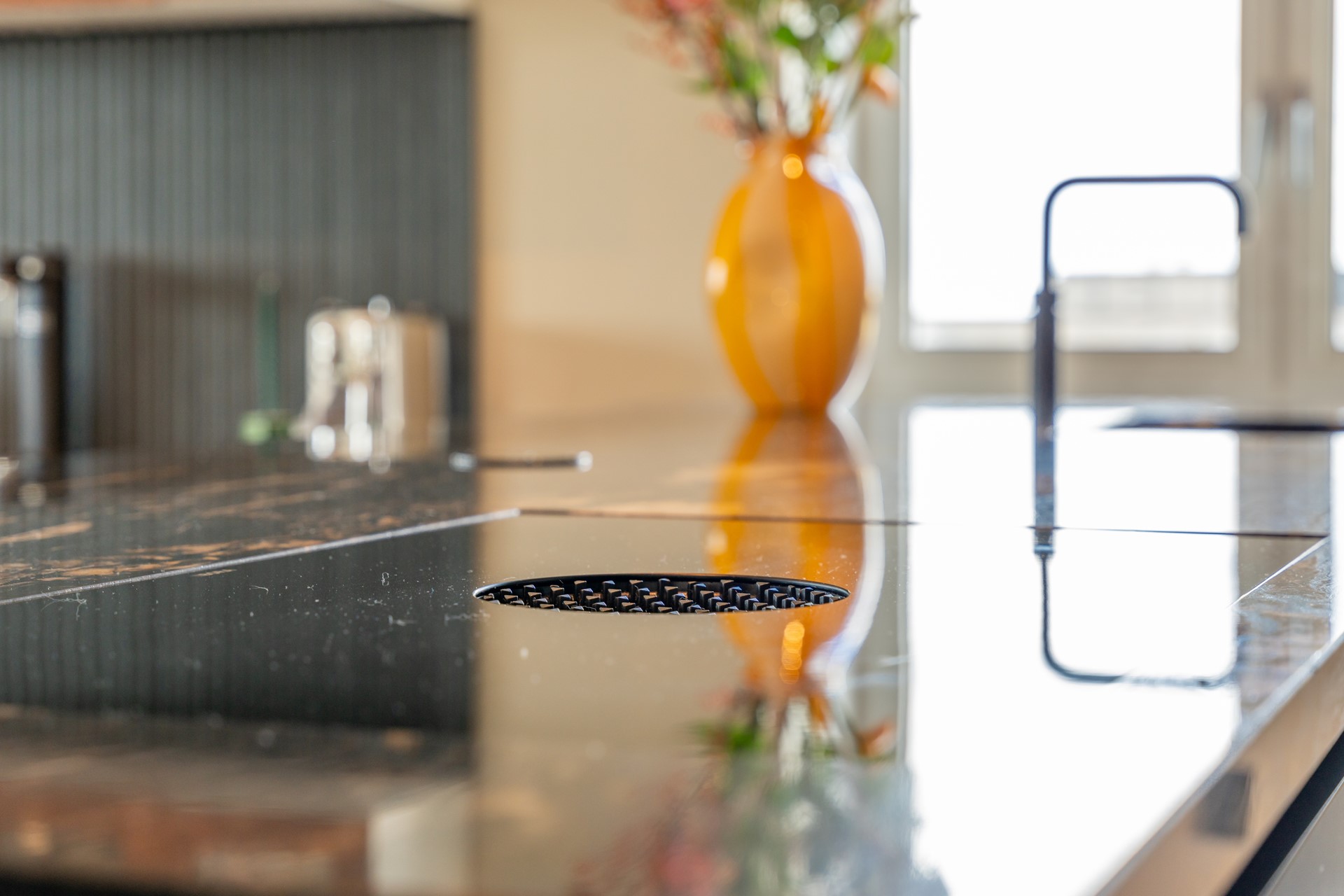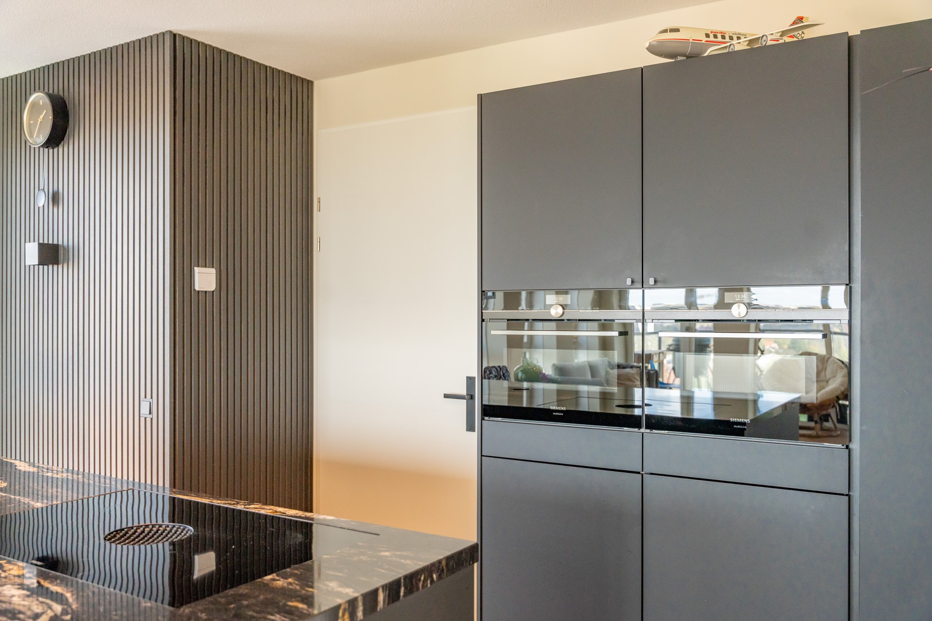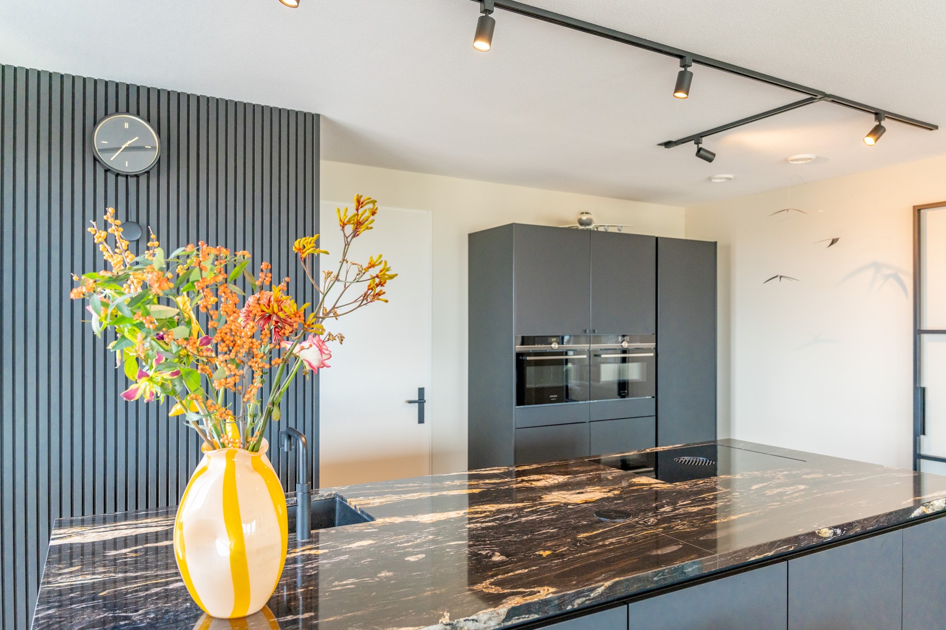 De open keuken is een ware eyecatcher, uitgevoerd in matzwart met een natuurstenen blad geïmporteerd uit Zuid-Amerika. De keuken is voorzien van Siemens inbouwapparatuur, een Bora PUXU-afzuigsysteem en een Quooker. Direct aangrenzend bevindt zich een praktische bijkeuken met wasmachineaansluiting en extra bergruimte.