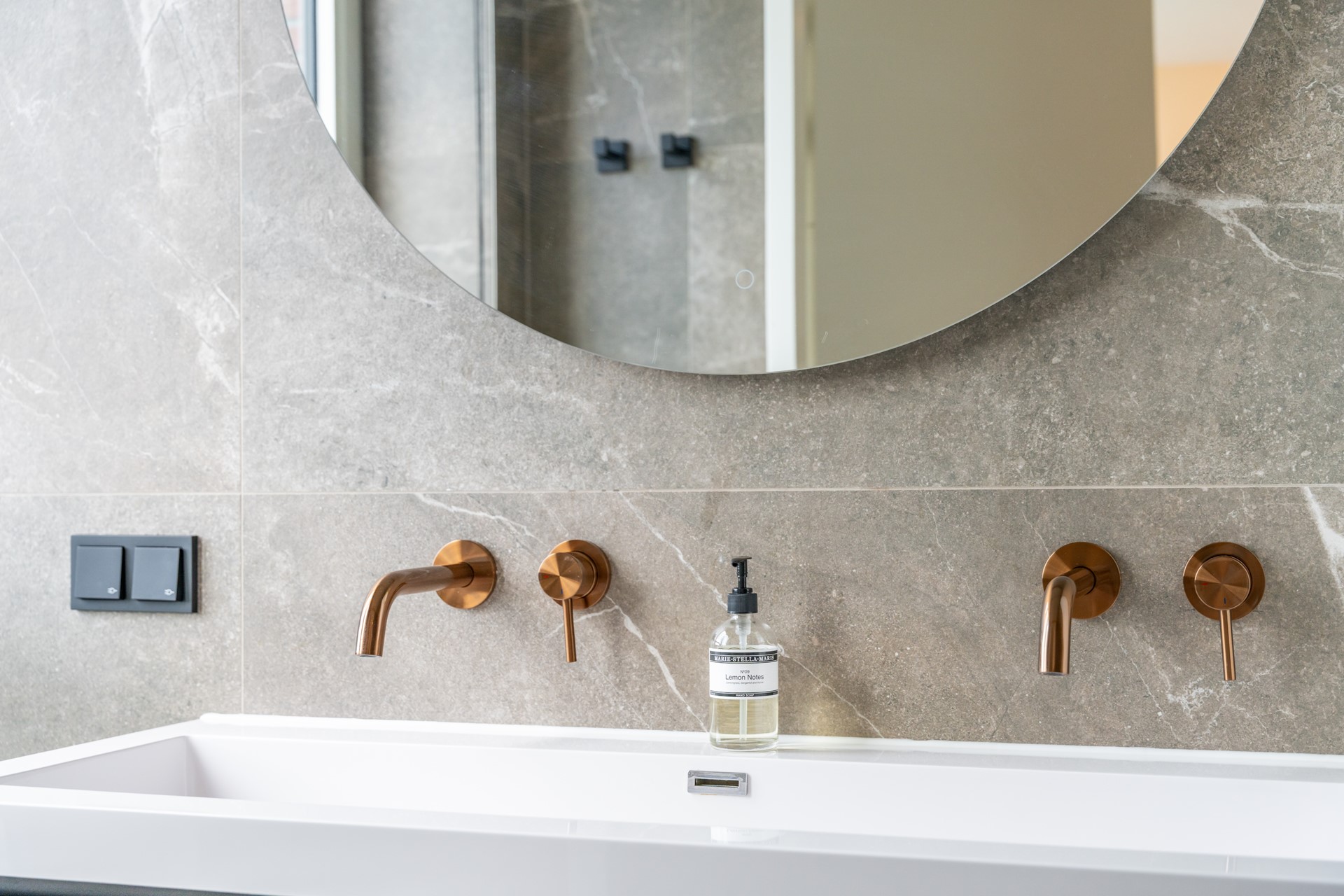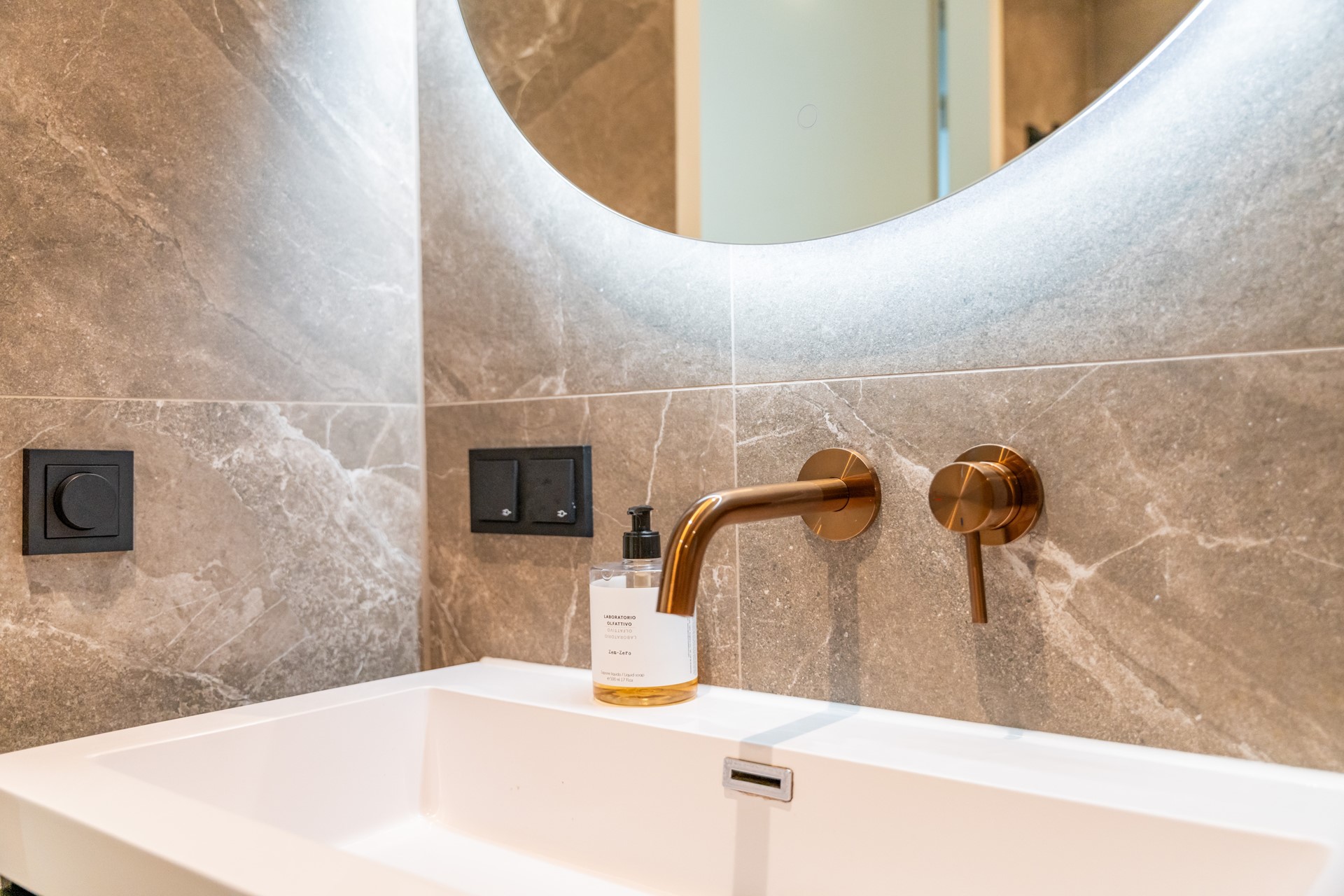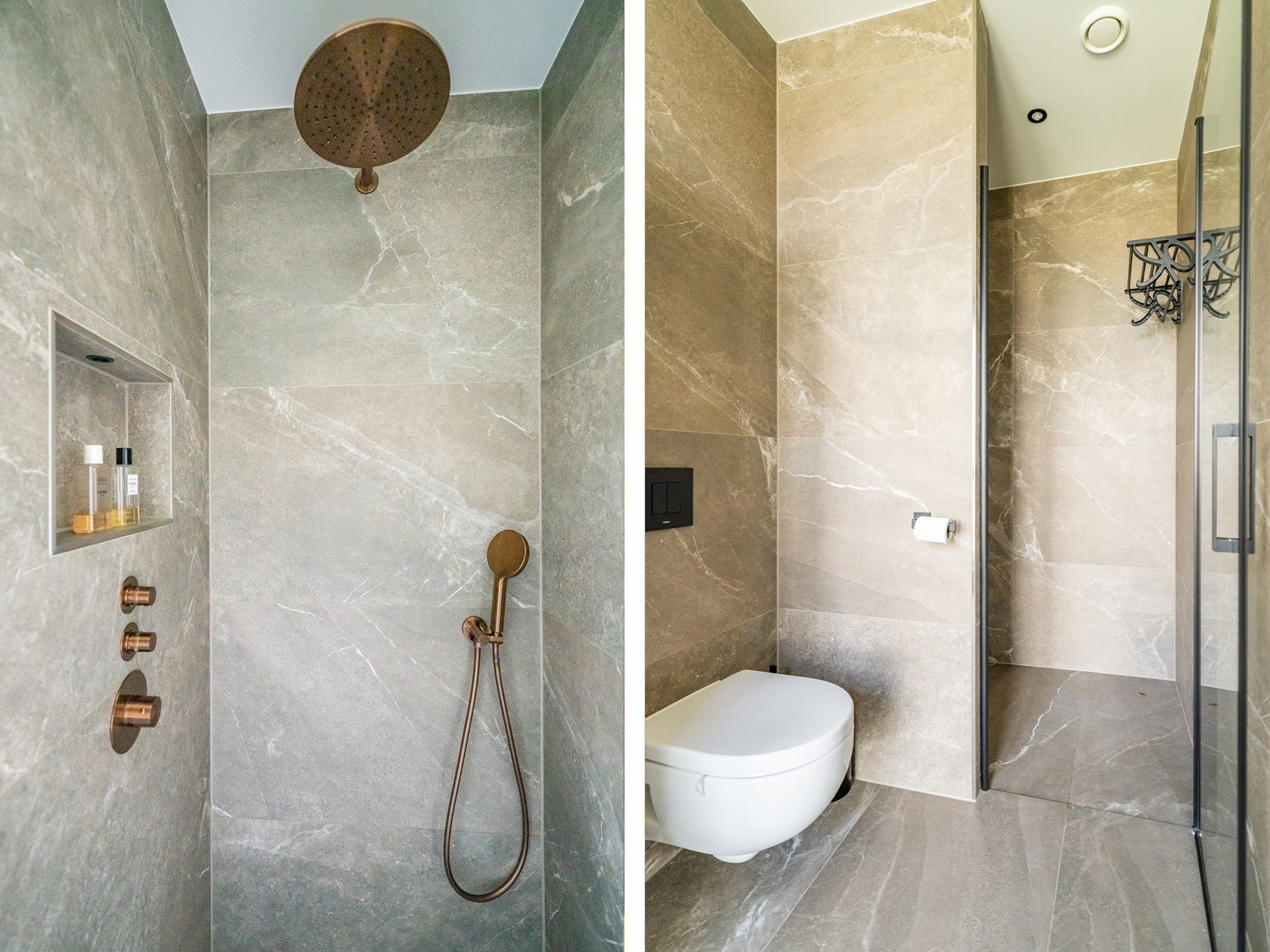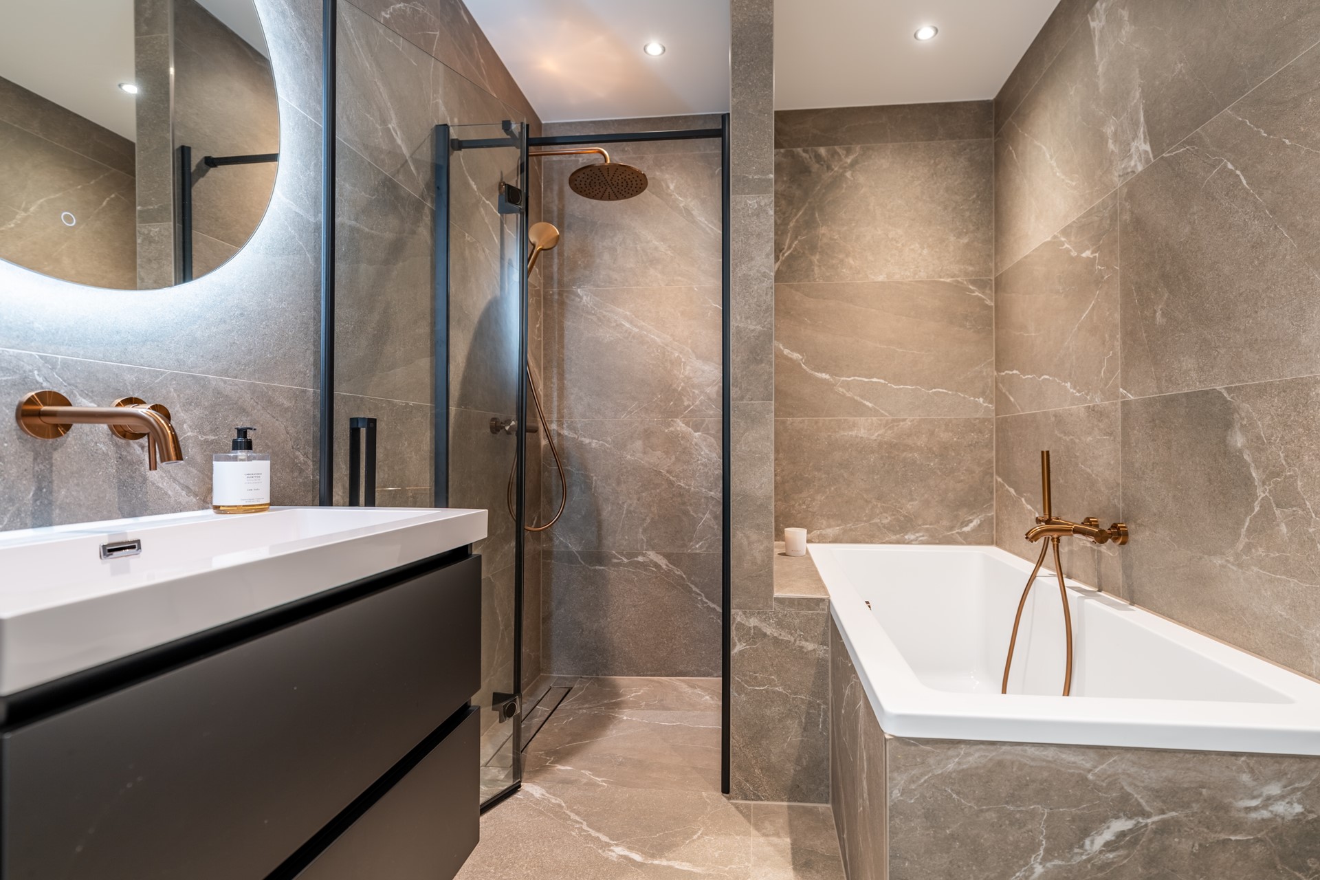 De woning beschikt over drie slaapkamers, waaronder een master bedroom met luxe en-suite badkamer voorzien van inloopdouche, tweede toilet en wastafelmeubel. De tweede badkamer beschikt over een ligbad, tweede douche en eveneens een stijlvol meubel. Eén van de kamers is momenteel ingericht als indrukwekkende walk-in closet.