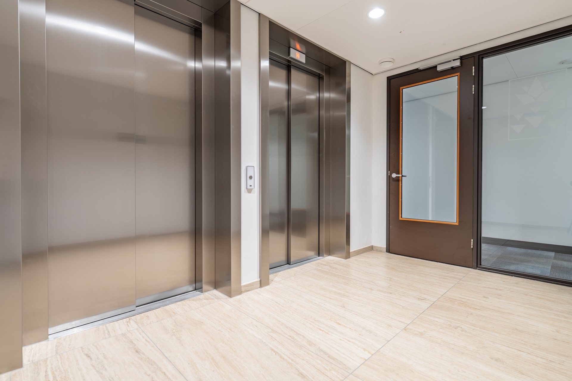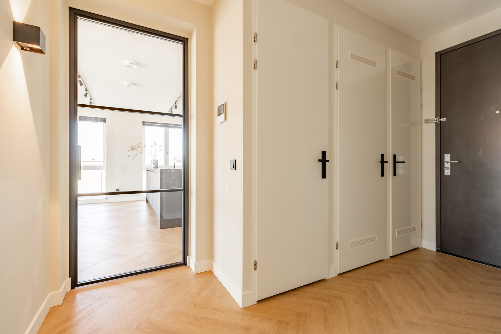 De entree van het complex straalt direct allure uit: een stijlvolle centrale hal met lift brengt u naar de twaalfde verdieping, waar de woning zich opent met een royale ontvangsthal. Hier bevinden zich een ingebouwde garderobe, separaat toilet en de technische ruimte met de moderne warmtepompinstallatie.