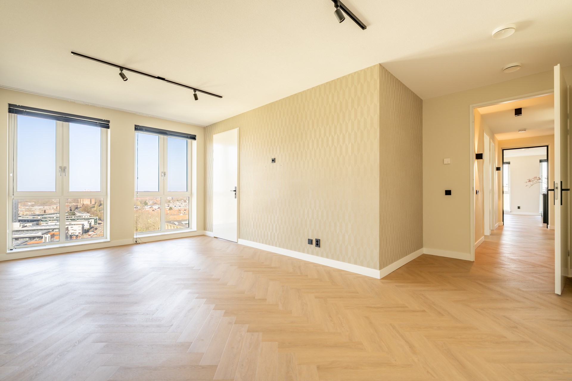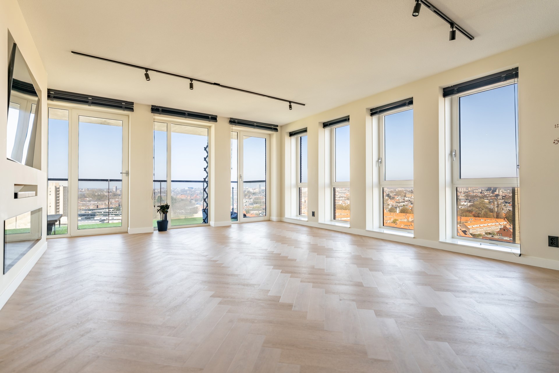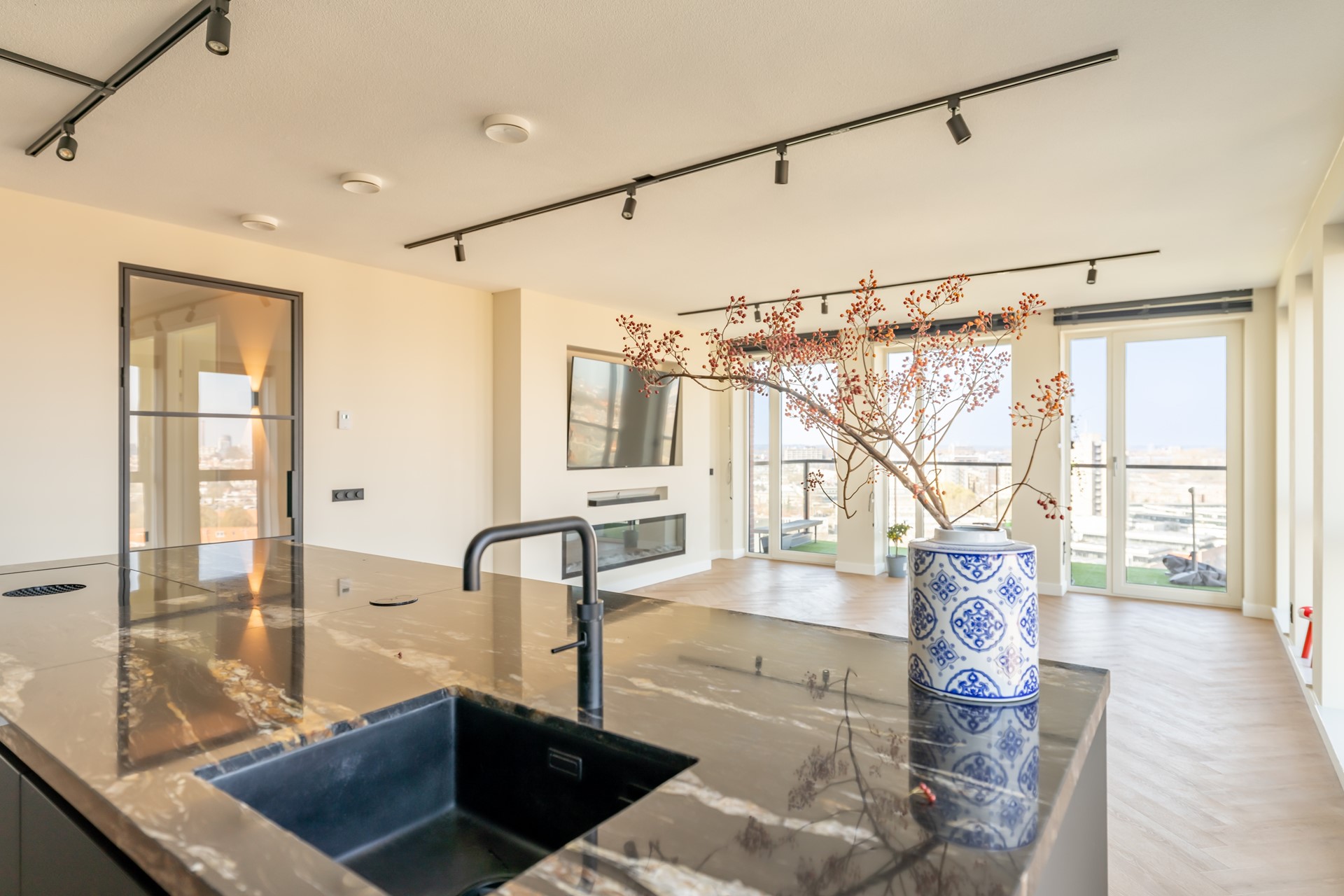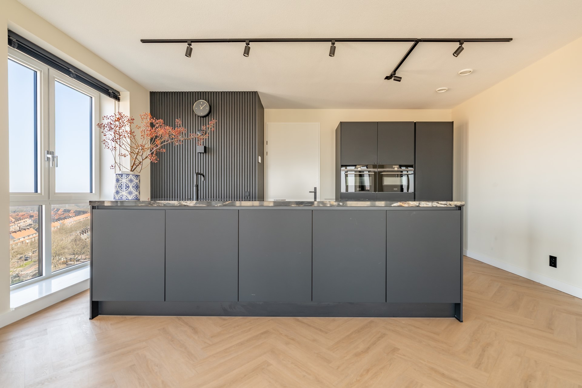 De riante woonkamer is een waar pronkstuk, met grote raampartijen die zorgen voor een overvloed aan licht en een spectaculair uitzicht over Leiden. De sfeervolle cinewall met ingebouwde haard en de hoogwaardige afwerking creëren een luxueuze ambiance. Vanuit de woonkamer is er toegang tot het ruime balkon van circa 12 m², gelegen op het westen — een heerlijke plek om te genieten van de middag- en avondzon. In de zomer kun je hier nog lang genieten van de ondergaande zon.