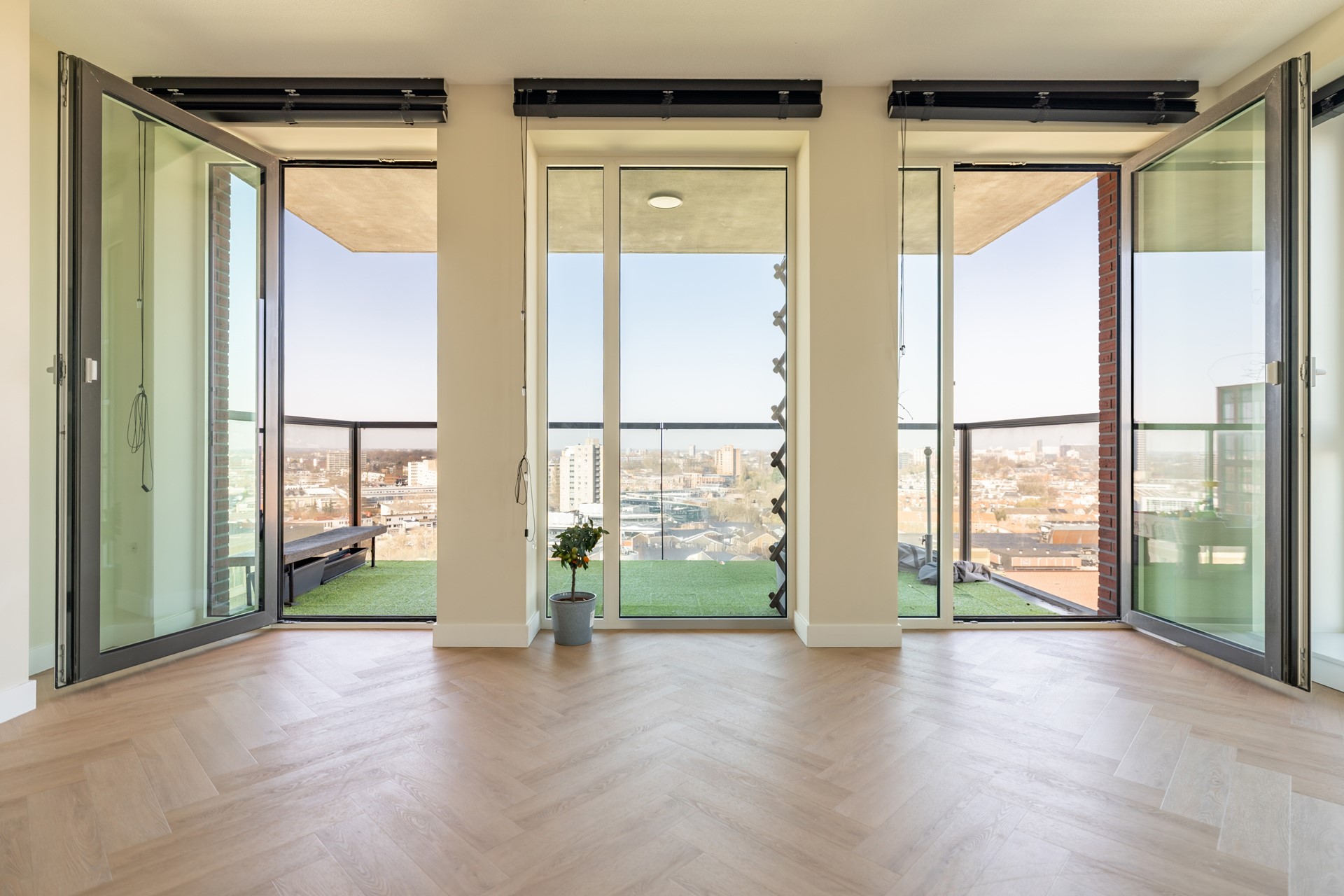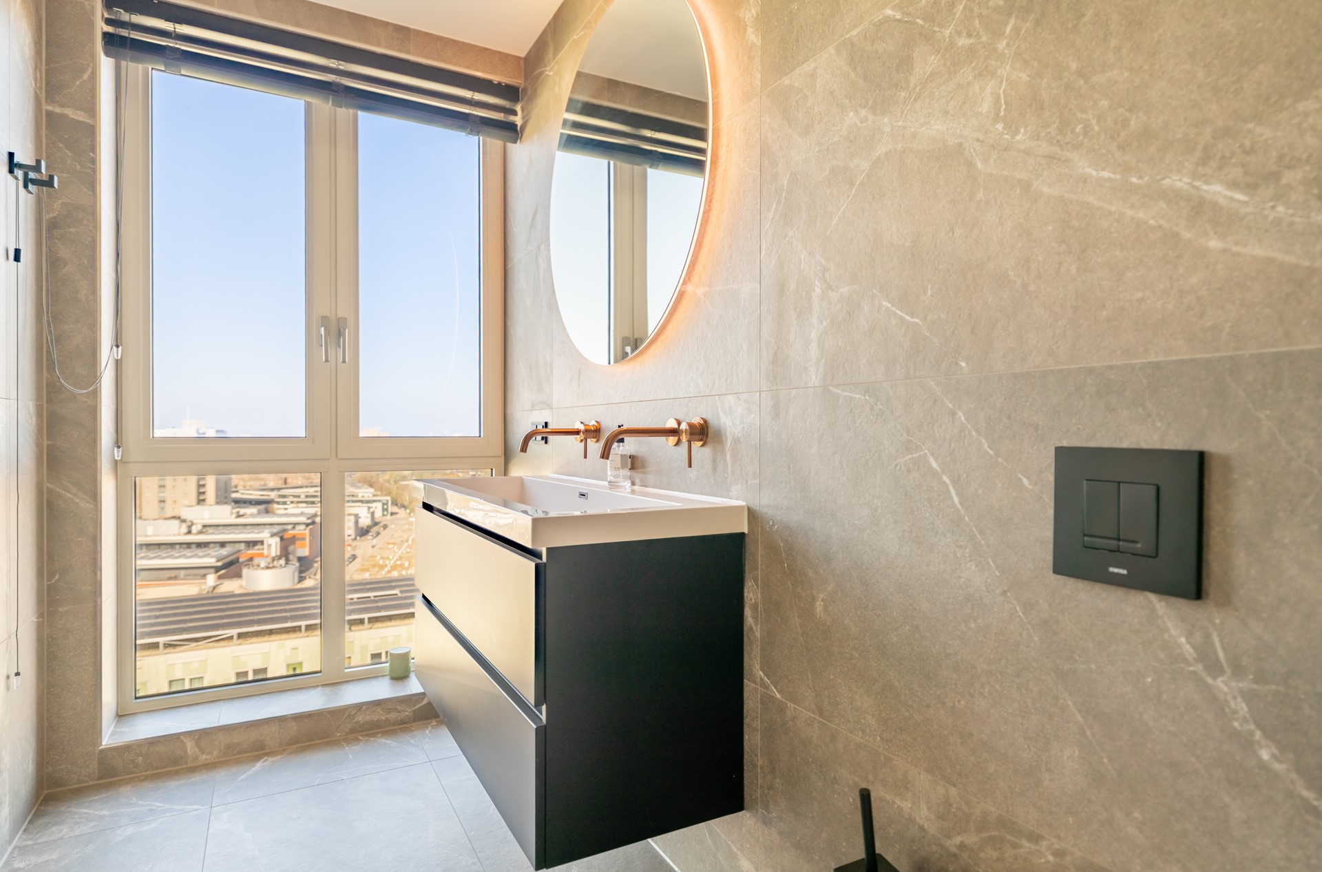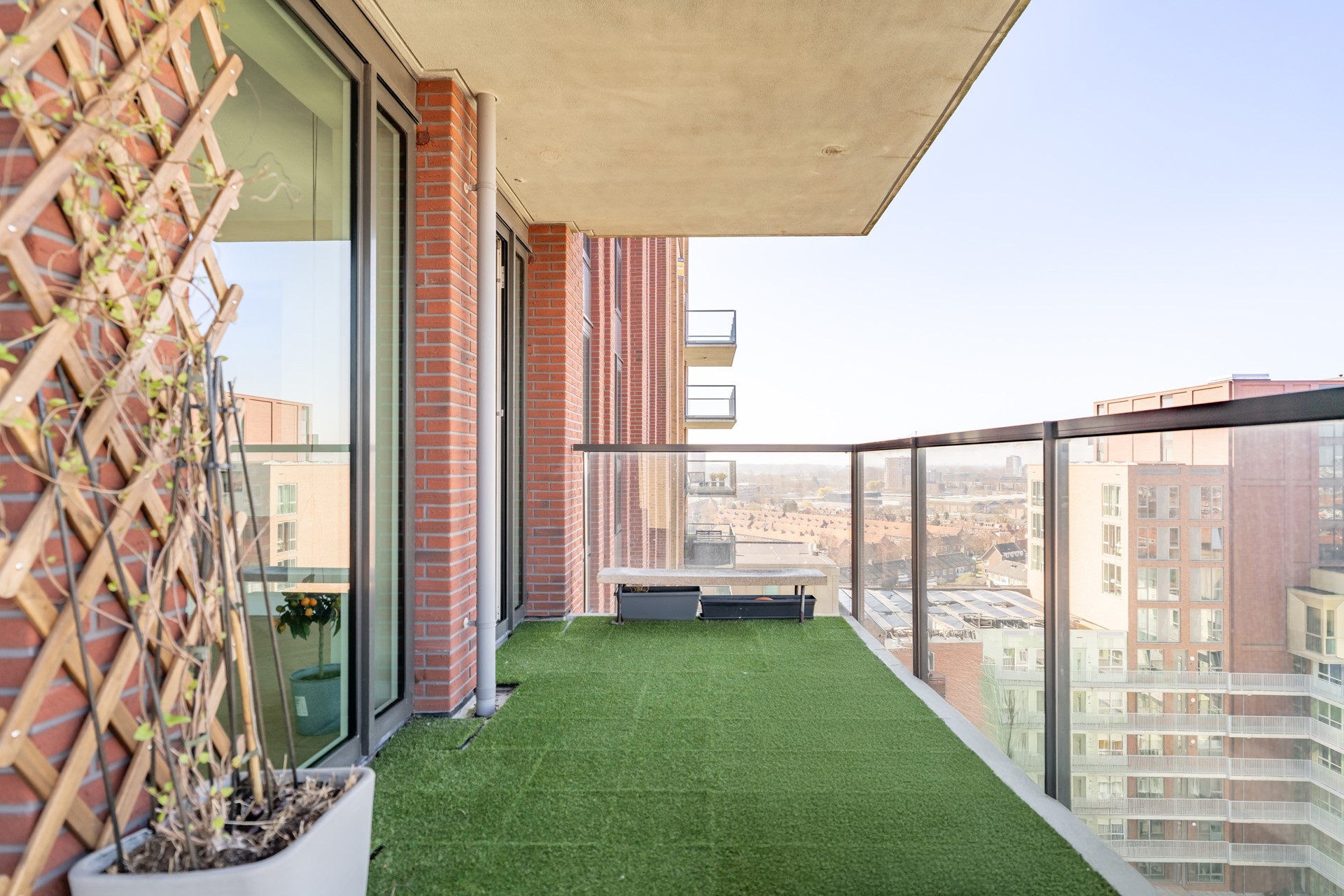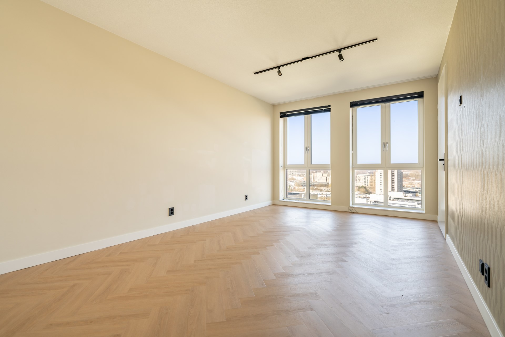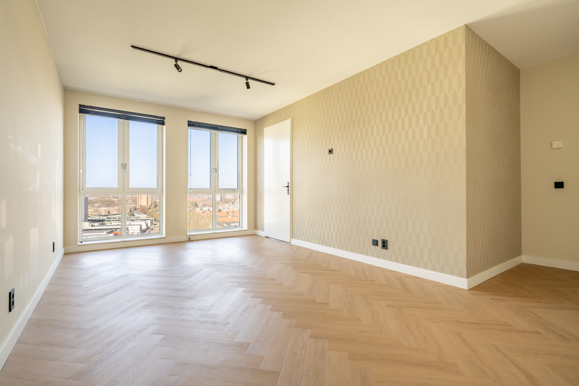 De riante woonkamer is een waar pronkstuk, met grote raampartijen die zorgen voor een overvloed aan licht en een spectaculair uitzicht over Leiden. De sfeervolle cinewall met ingebouwde haard en de hoogwaardige afwerking creëren een luxueuze ambiance. Vanuit de woonkamer is er toegang tot het ruime balkon van circa 12 m², gelegen op het westen — een heerlijke plek om te genieten van de middag- en avondzon. In de zomer kun je hier nog lang genieten van de ondergaande zon.