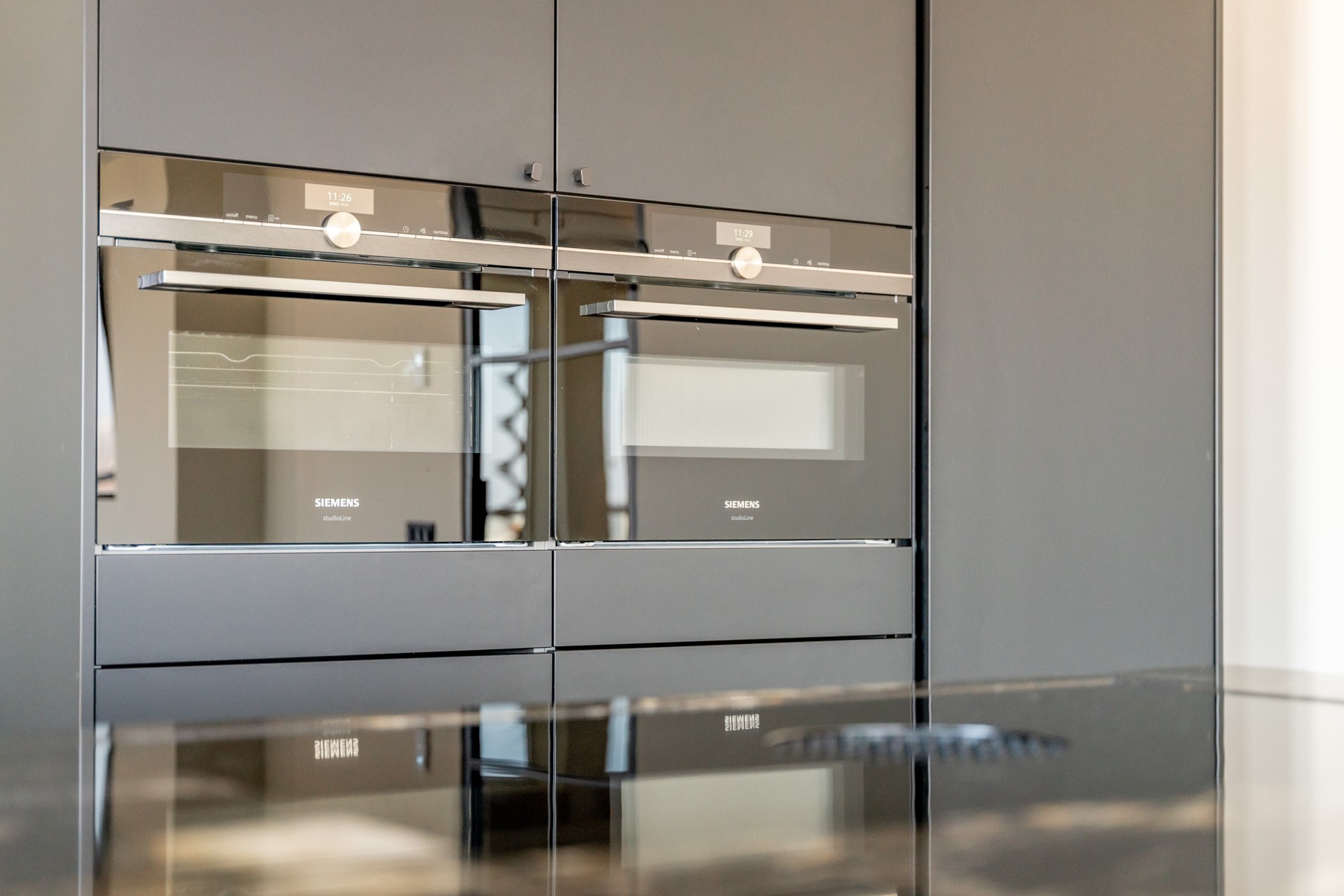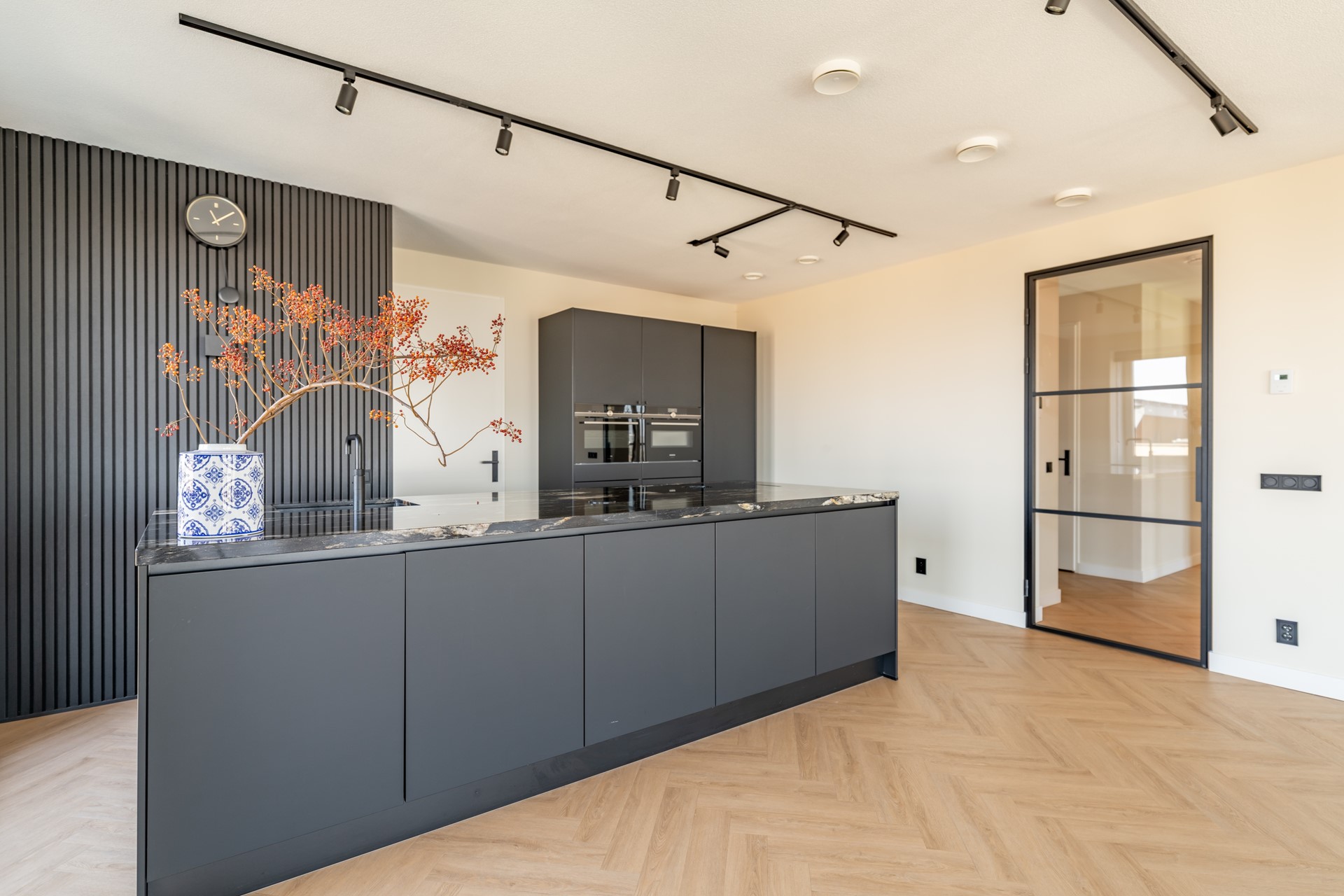 De open keuken is een ware eyecatcher, uitgevoerd in matzwart met een natuurstenen blad geïmporteerd uit Zuid-Amerika. De keuken is voorzien van Siemens inbouwapparatuur, een Bora PUXU-afzuigsysteem en een Quooker. Direct aangrenzend bevindt zich een praktische bijkeuken met wasmachineaansluiting en extra bergruimte.