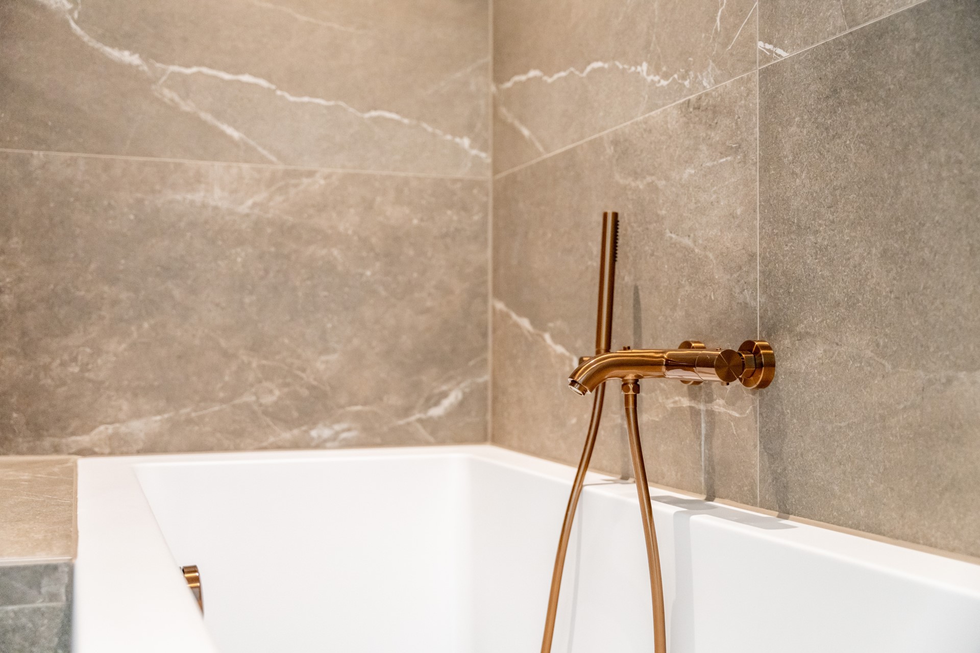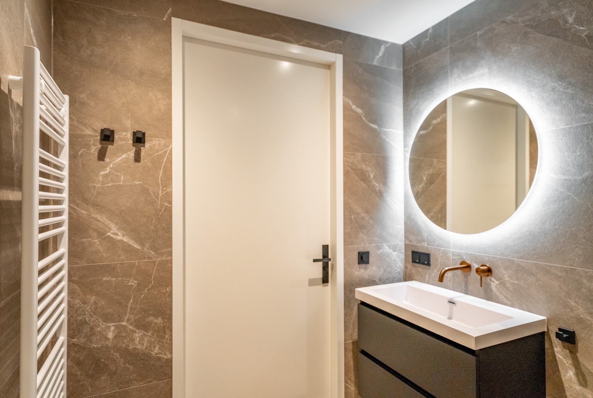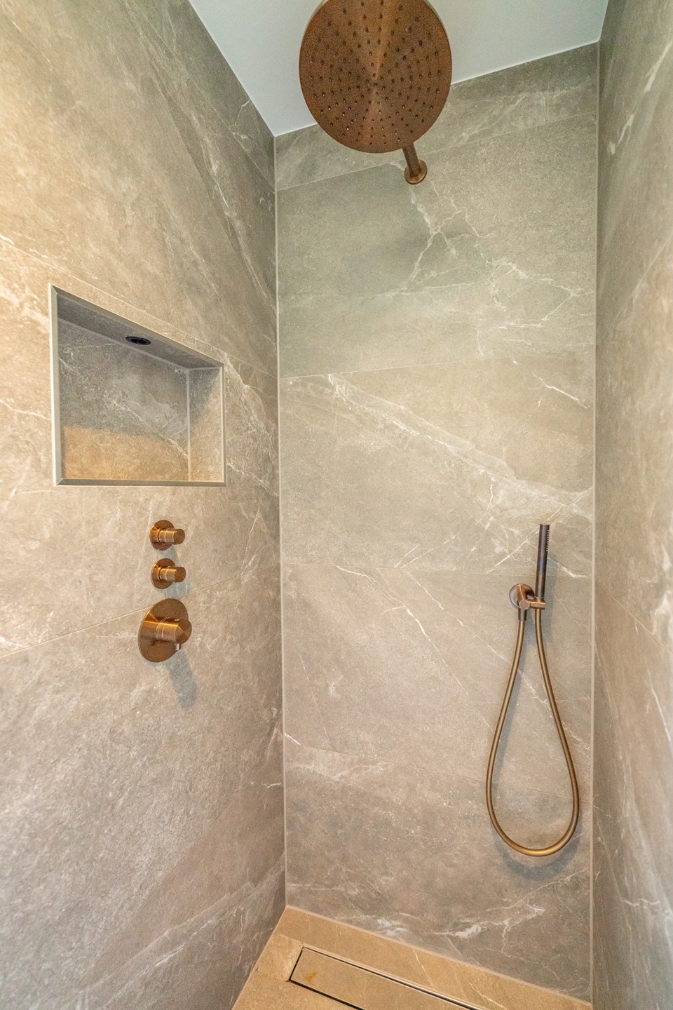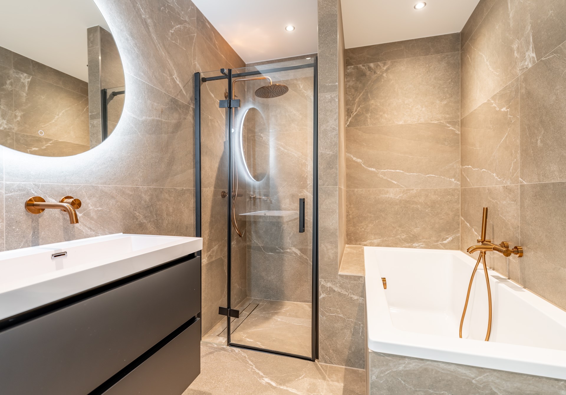 De woning beschikt over drie slaapkamers, waaronder een master bedroom met luxe en-suite badkamer voorzien van inloopdouche, tweede toilet en wastafelmeubel. De tweede badkamer beschikt over een ligbad, tweede douche en eveneens een stijlvol meubel.