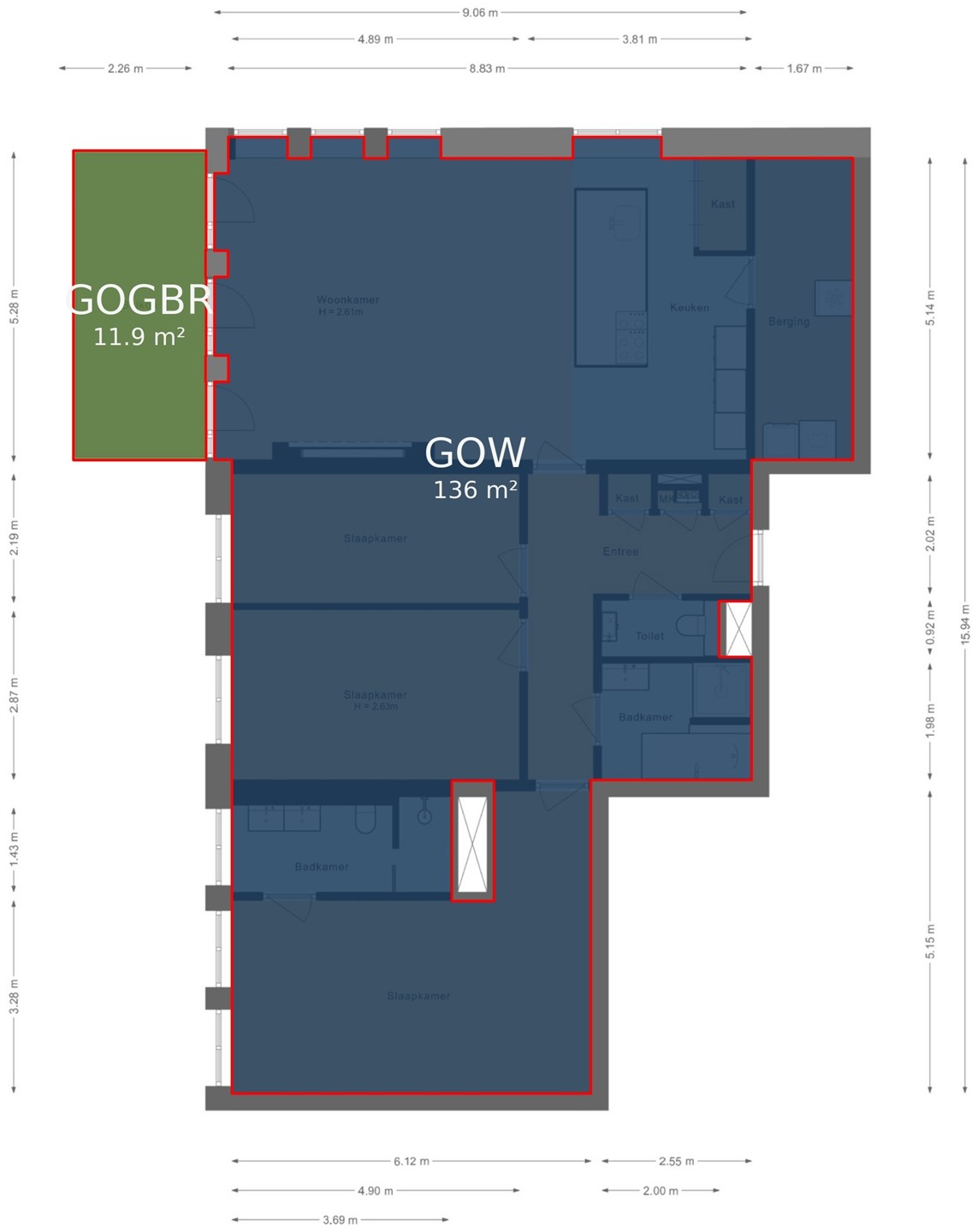Oppervlakte overige inpandige ruimten