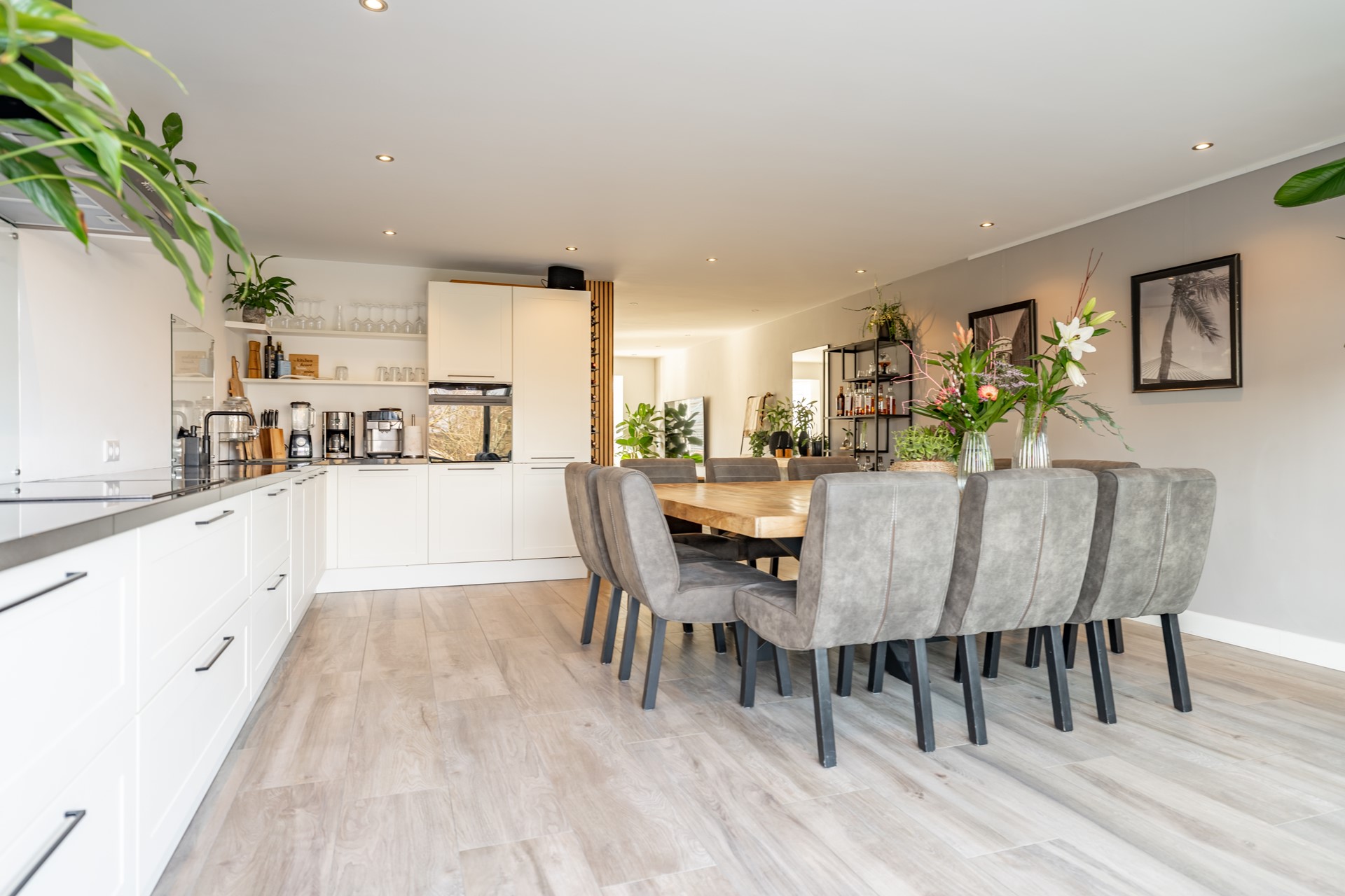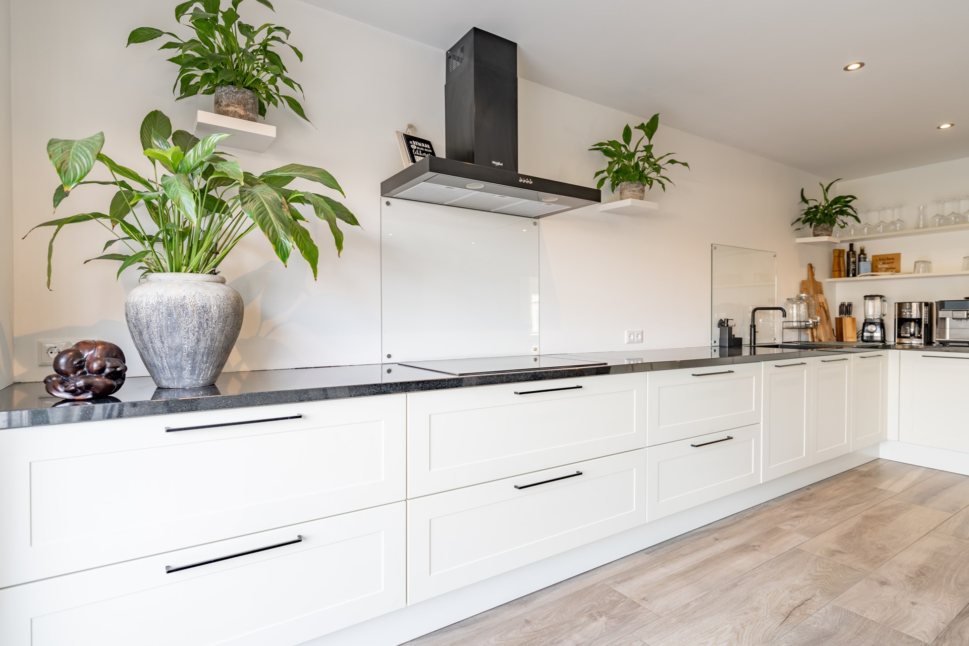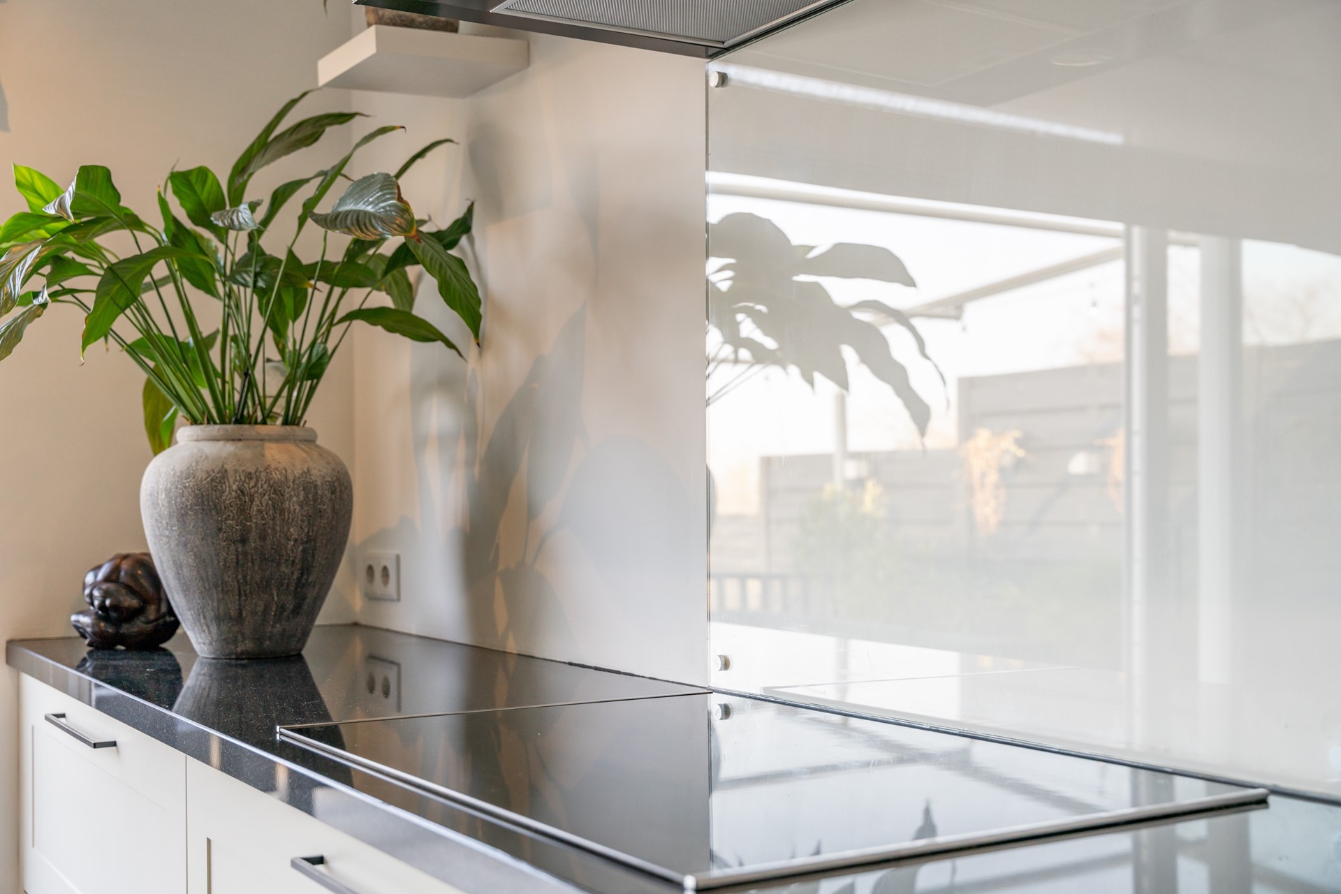 Aan de achterzijde is de woning in 2020 circa 3,5 meter uitgebouwd. Hierdoor is een ruime leefkeuken ontstaan die het hart van de woning vormt. De keuken is luxe uitgevoerd en voorzien van diverse inbouwapparatuur zoals een oven, koelkast, vriezer, afzuigkap, keramische kookplaat en een Quooker met gefilterd én sparkling water. Het granieten werkblad geeft de keuken een stijlvolle en robuuste uitstraling.