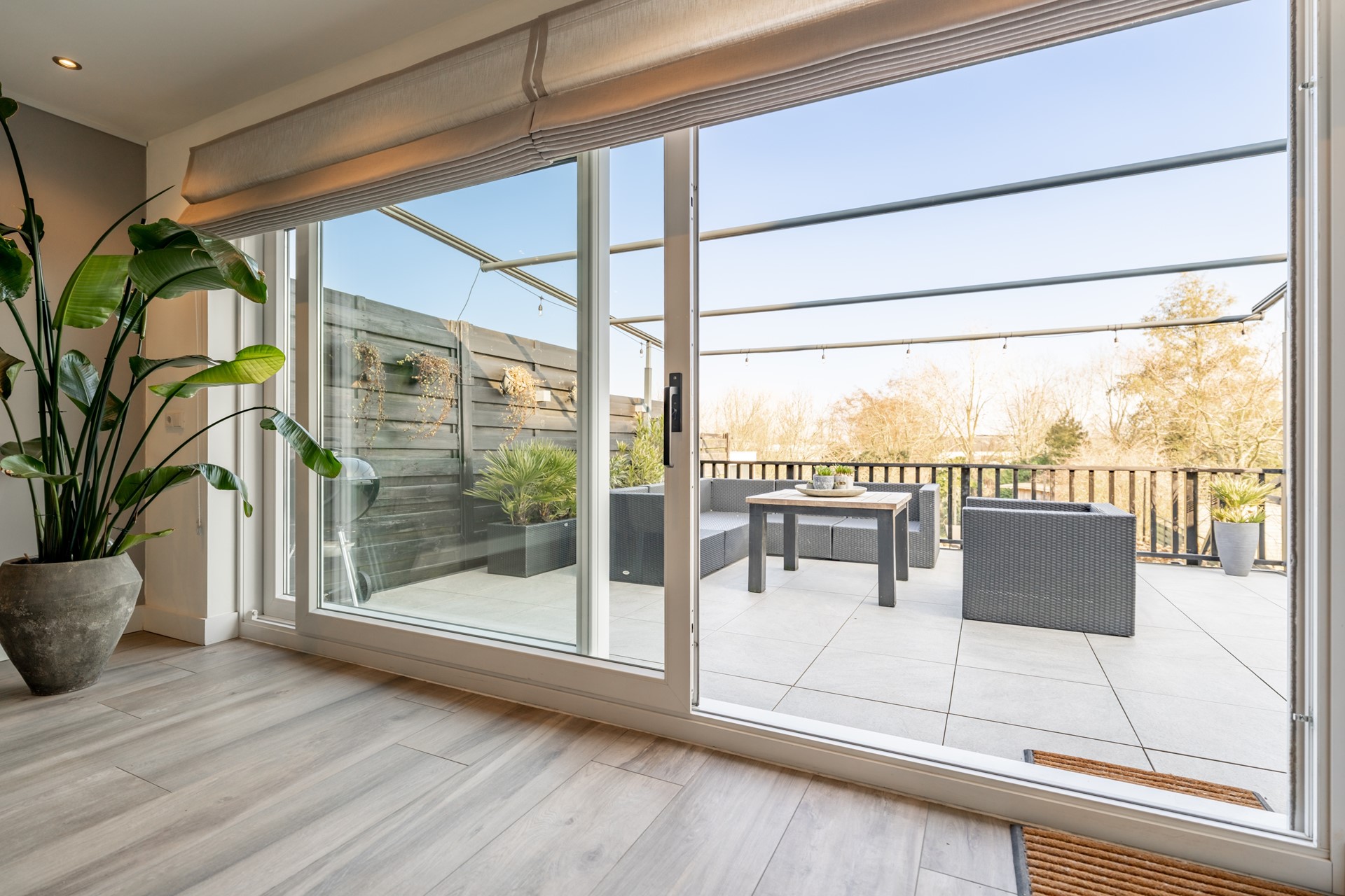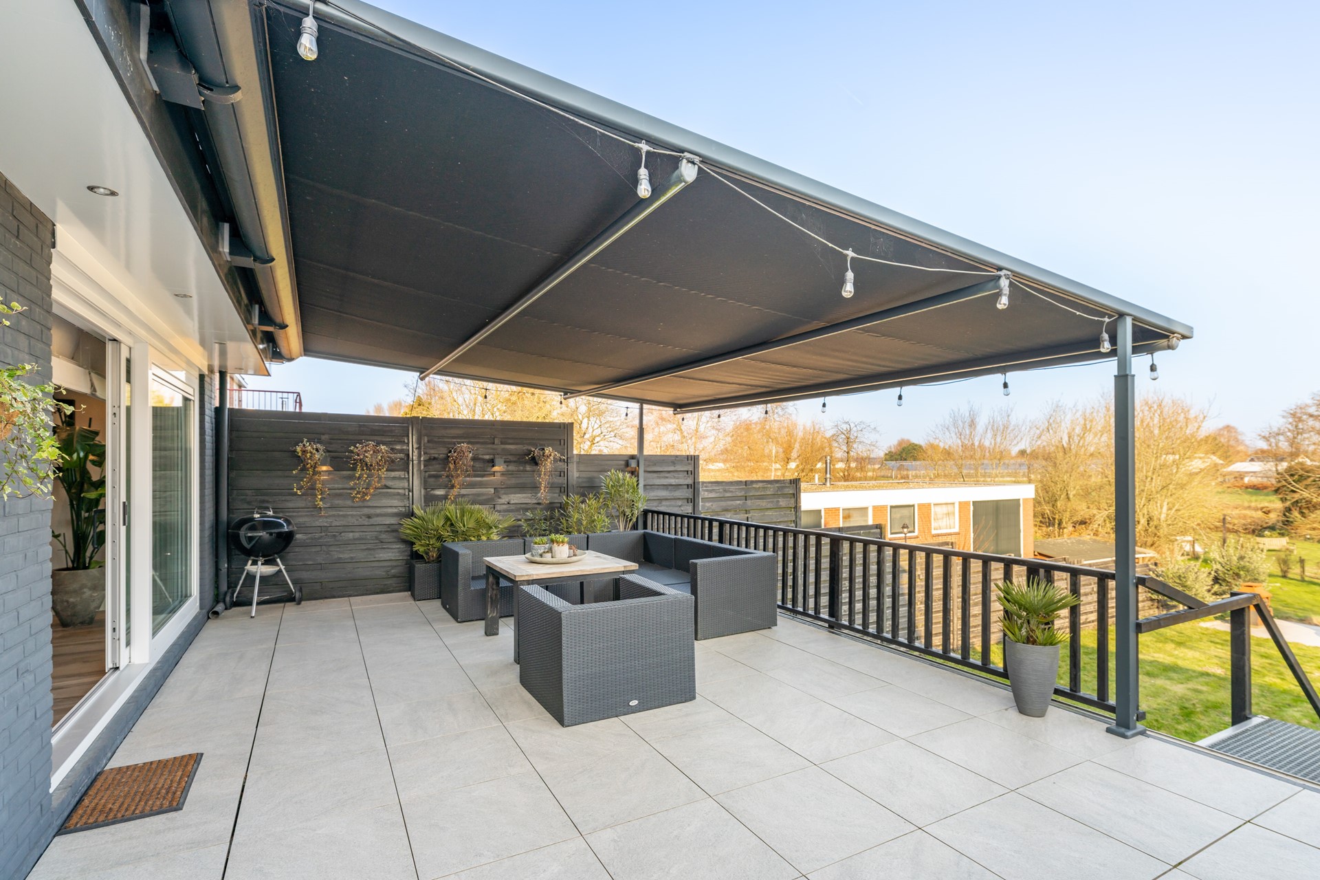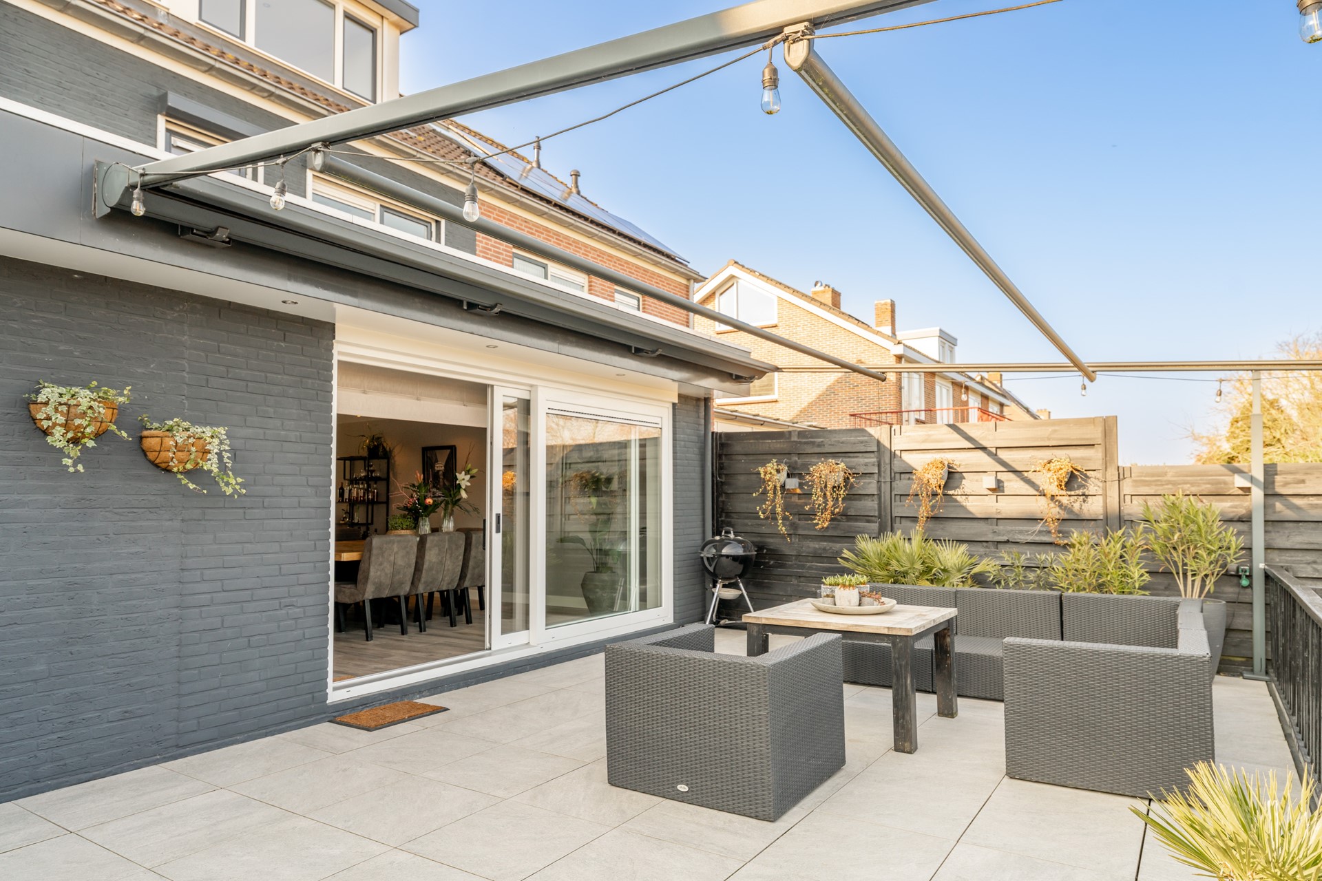 Via een kunststof pui bereikt u het royale dakterras. Een heerlijke plek om buiten te zitten met uitzicht over de tuin en de omgeving. Dankzij het aanwezige zonnescherm kunt u hier zowel in de zon als in de schaduw comfortabel genieten. Via een trap bereikt u de diepe achtertuin van circa 20 meter diep en ongeveer 9 meter breed. De tuin ligt op het oosten, maar door de royale diepte kunt u hier vrijwel de hele dag van de zon genieten. De tuin is verzorgd aangelegd met een gazon, groenborders en beschikt over een praktische achterom.