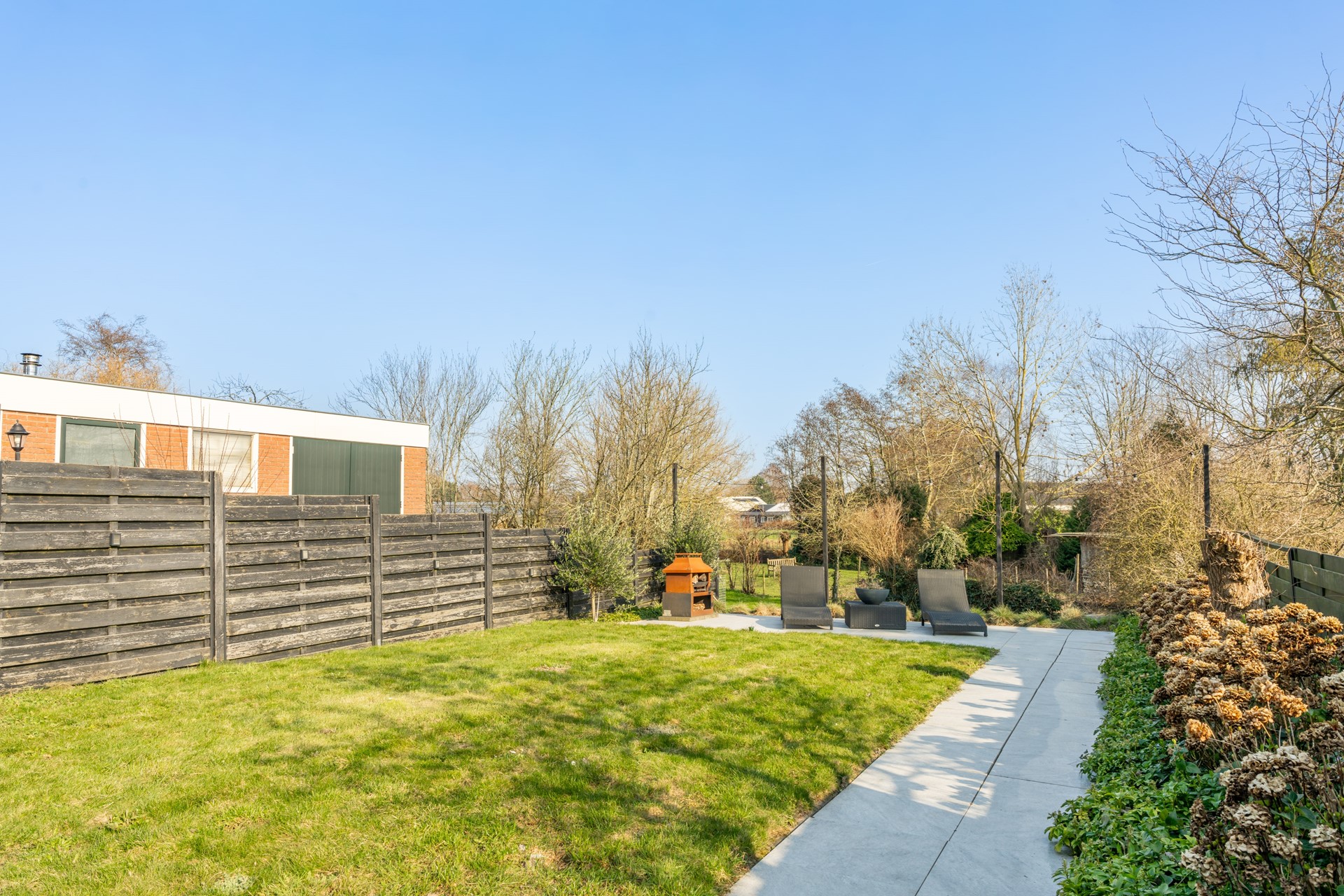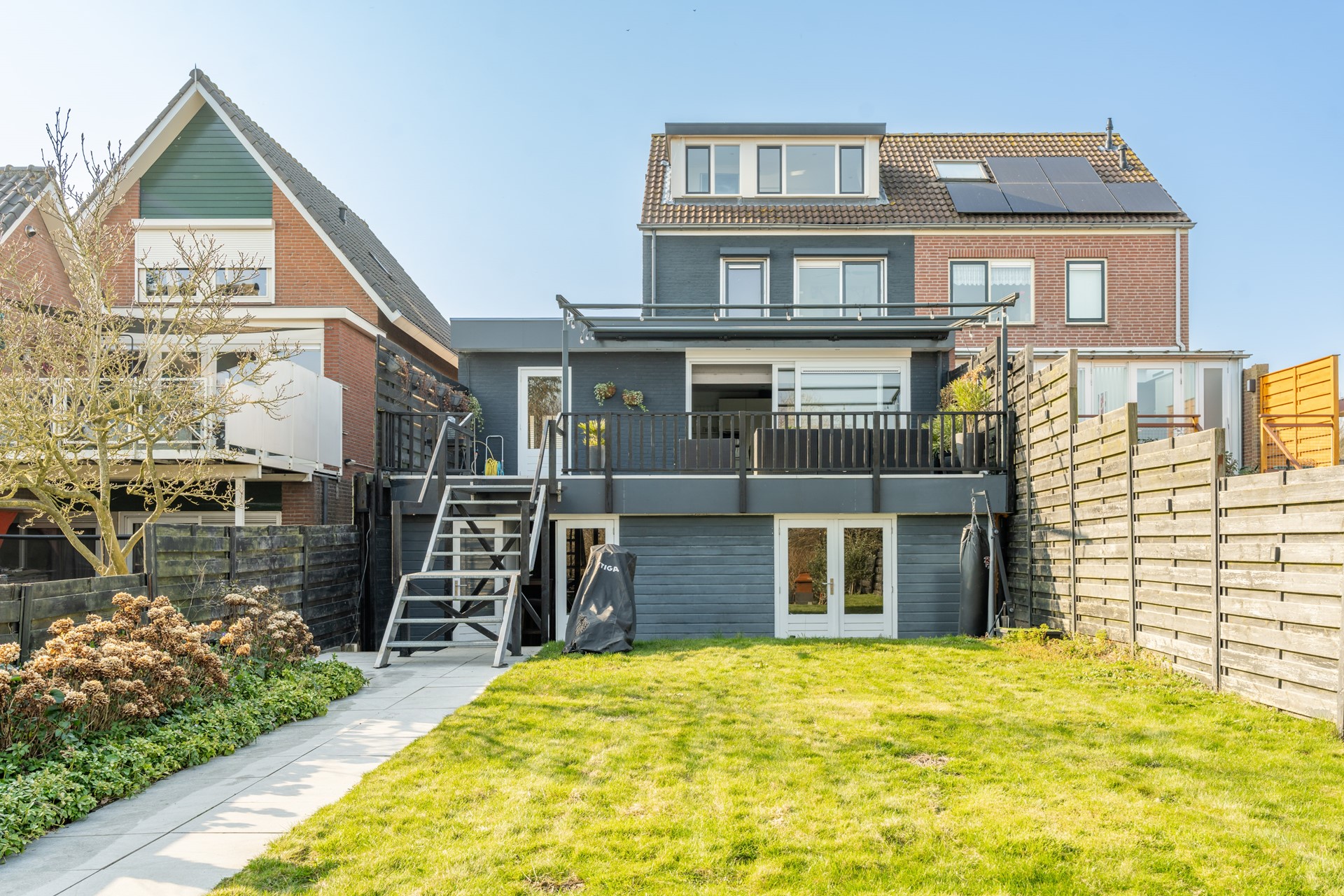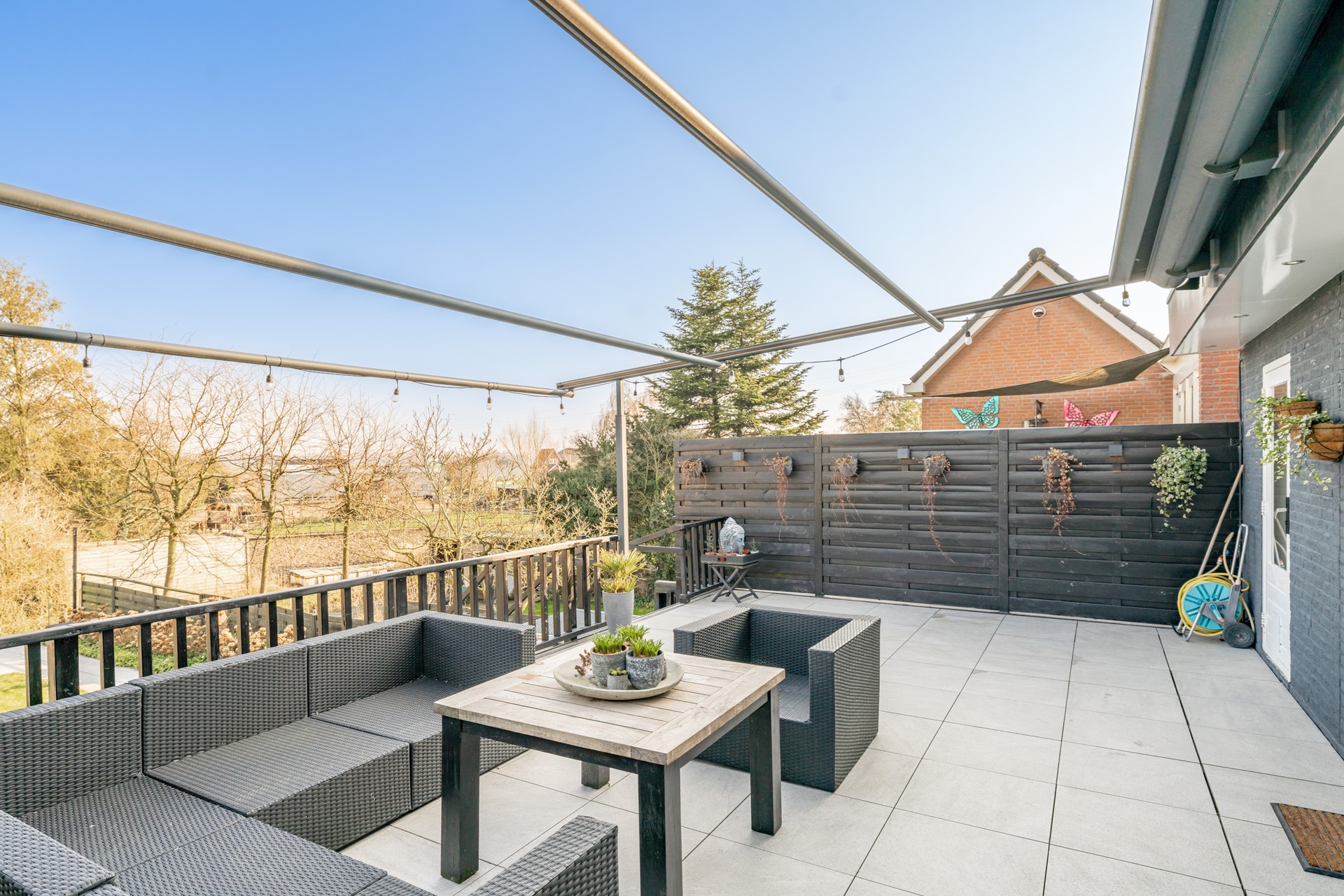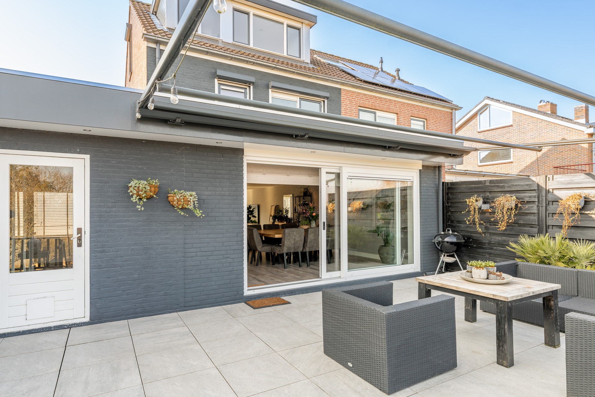 Via een kunststof pui bereikt u het royale dakterras. Een heerlijke plek om buiten te zitten met uitzicht over de tuin en de omgeving. Dankzij het aanwezige zonnescherm kunt u hier zowel in de zon als in de schaduw comfortabel genieten. Via een trap bereikt u de diepe achtertuin van circa 20 meter diep en ongeveer 9 meter breed. De tuin ligt op het oosten, maar door de royale diepte kunt u hier vrijwel de hele dag van de zon genieten. De tuin is verzorgd aangelegd met een gazon, groenborders en beschikt over een praktische achterom.