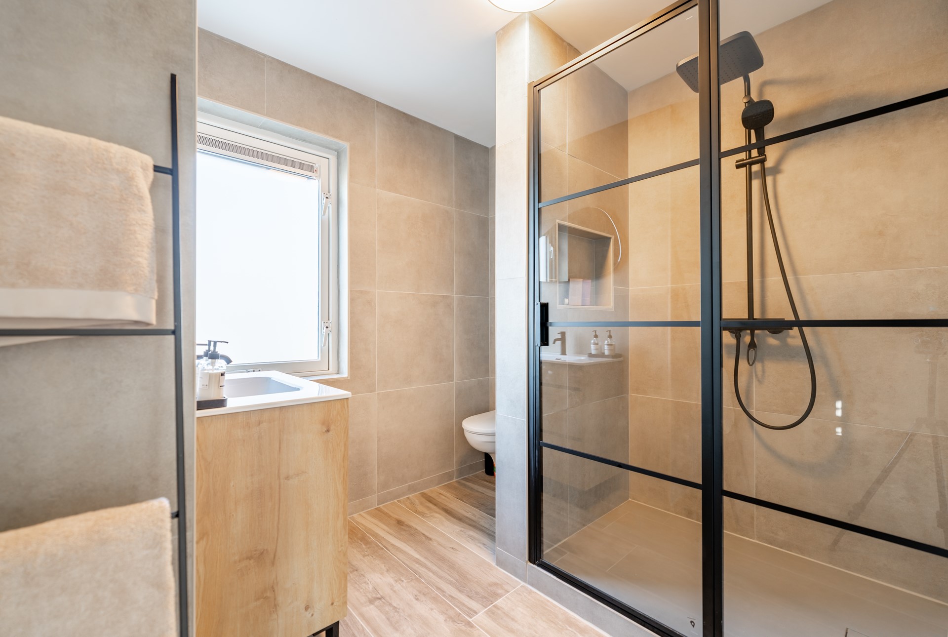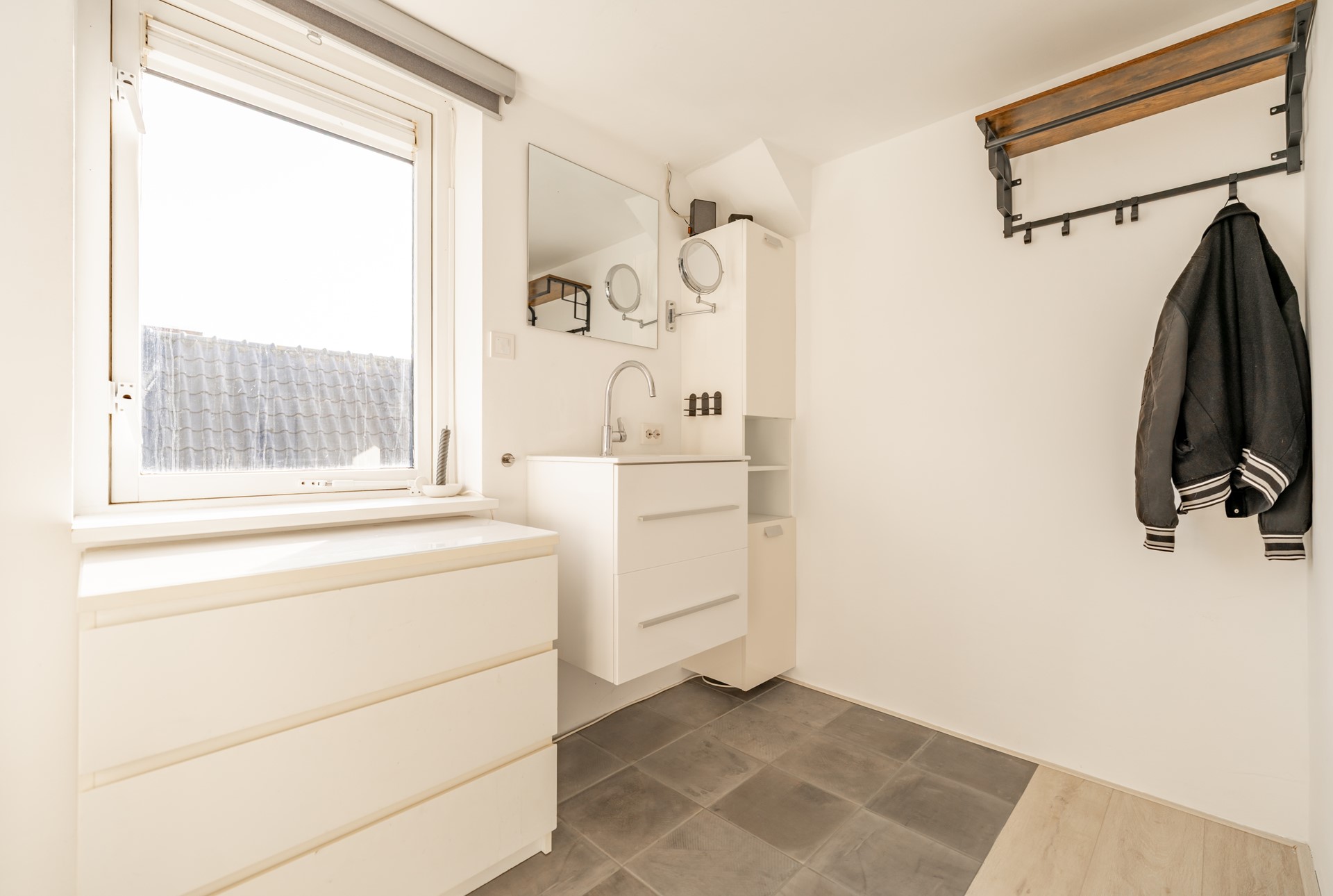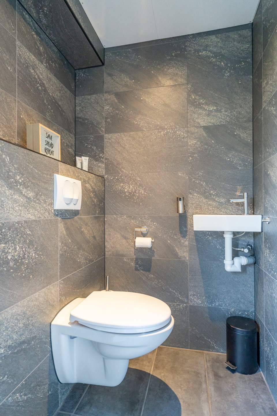 De aangebouwde stenen berging biedt praktische bergruimte en hier bevinden zich tevens de technische installaties zoals de CV-ketel, de omvormer van de zonnepanelen, de meterkast en de aansluitingen voor wasmachine en droger.