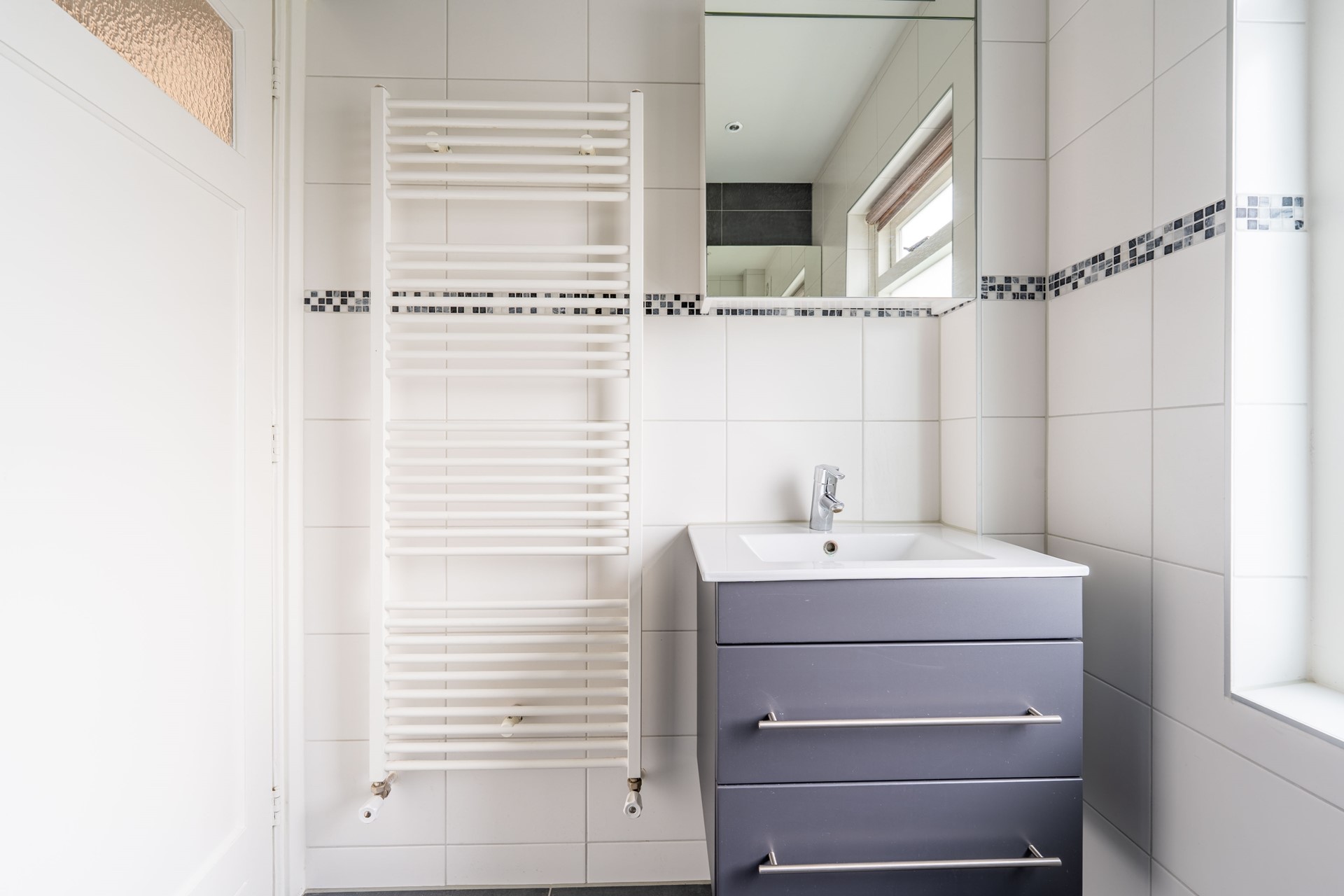 De moderne badkamer, aan de voorzijde gelegen, is voorzien van een inloopdouche, een wastafelmeubel en een tweede toilet. Dankzij het raam valt er prettig daglicht binnen en is er natuurlijke ventilatie aanwezig, wat zorgt voor een frisse en comfortabele ruimte.