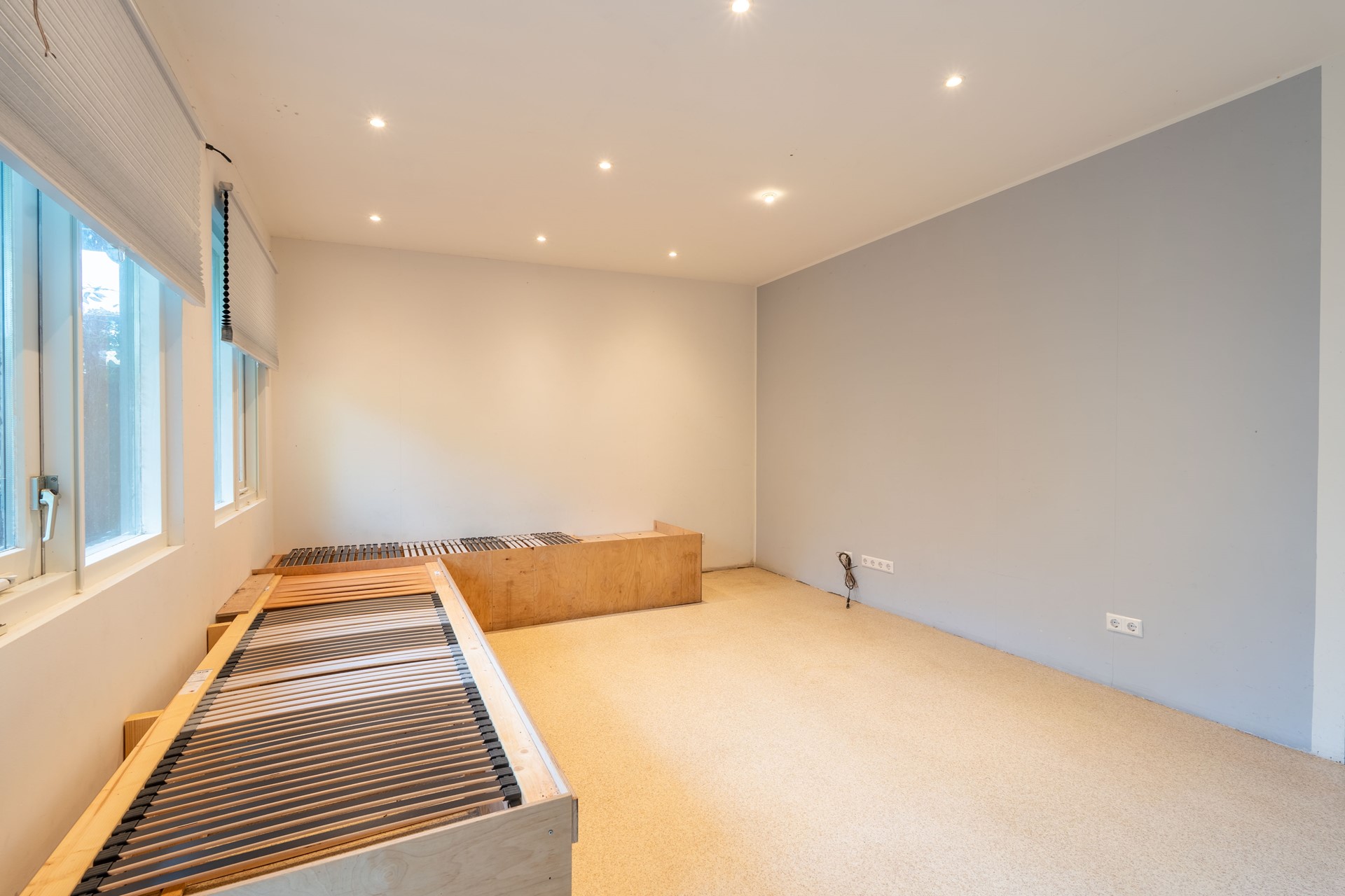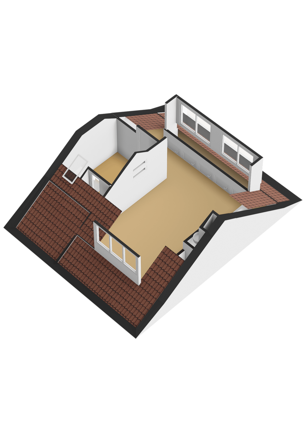 De vierde slaapkamer is royaal van formaat en dankzij de dakkapellen aan zowel de voor- als achterzijde uitzonderlijk licht en ruimtelijk. Hier is voldoende plaats voor een groot bed, een werkhoek of zelfs een extra zithoek. Achter de knieschotten bevindt zich bovendien praktische bergruimte.