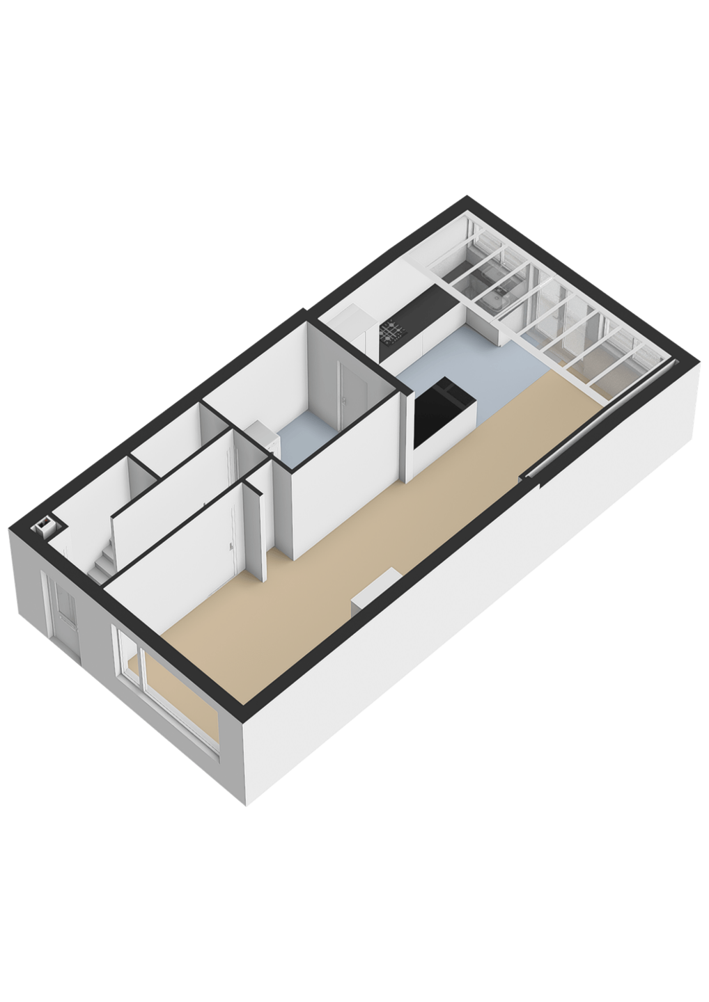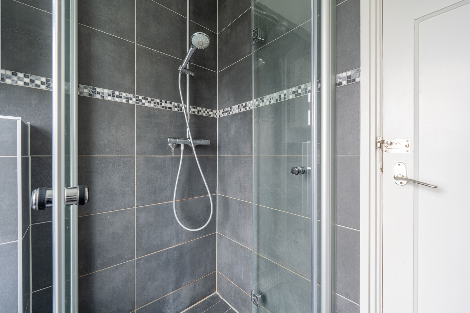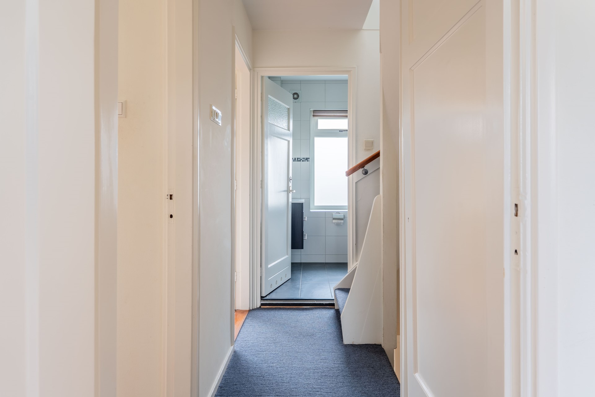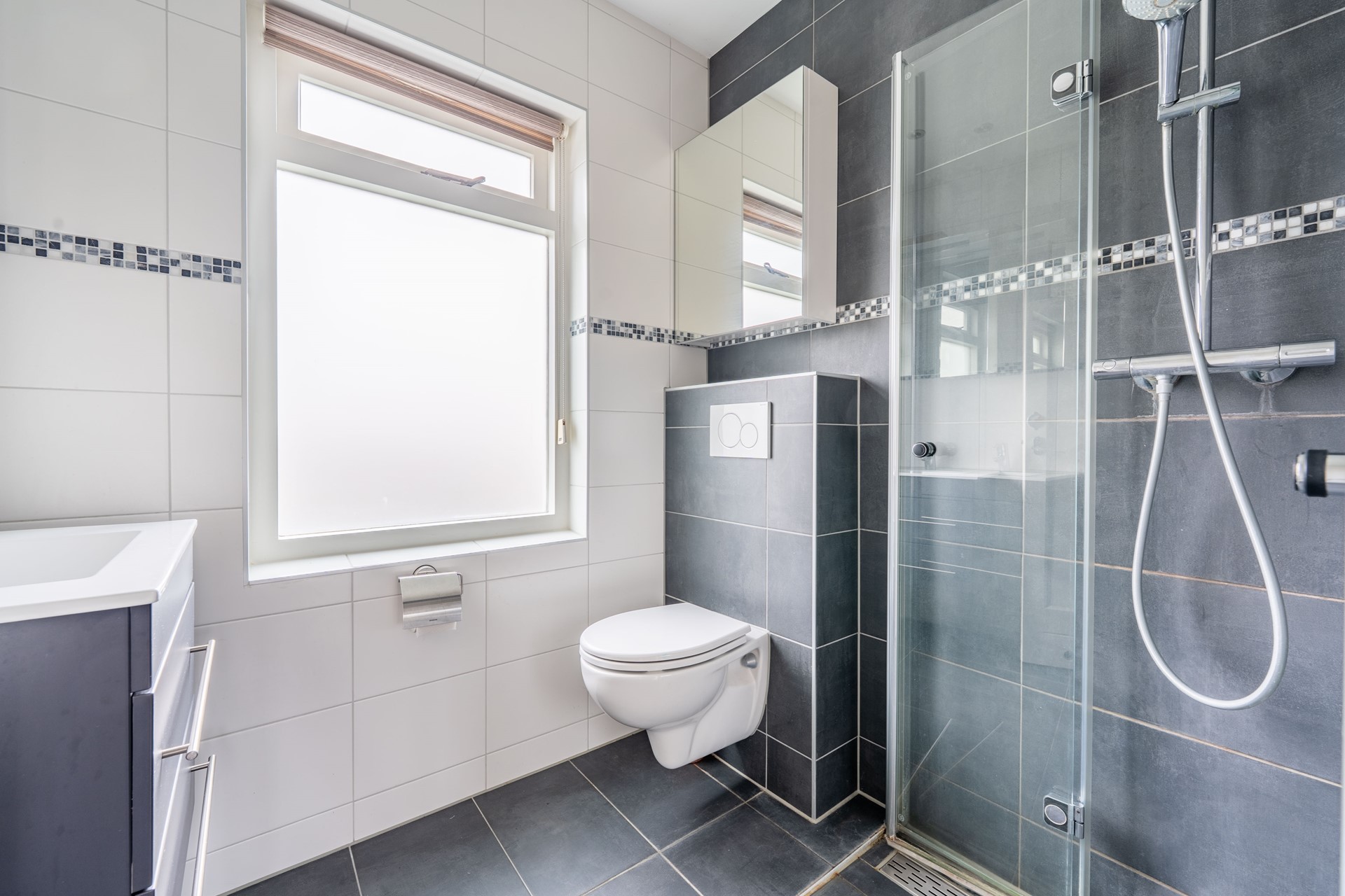 De moderne badkamer, aan de voorzijde gelegen, is voorzien van een inloopdouche, een wastafelmeubel en een tweede toilet. Dankzij het raam valt er prettig daglicht binnen en is er natuurlijke ventilatie aanwezig, wat zorgt voor een frisse en comfortabele ruimte.