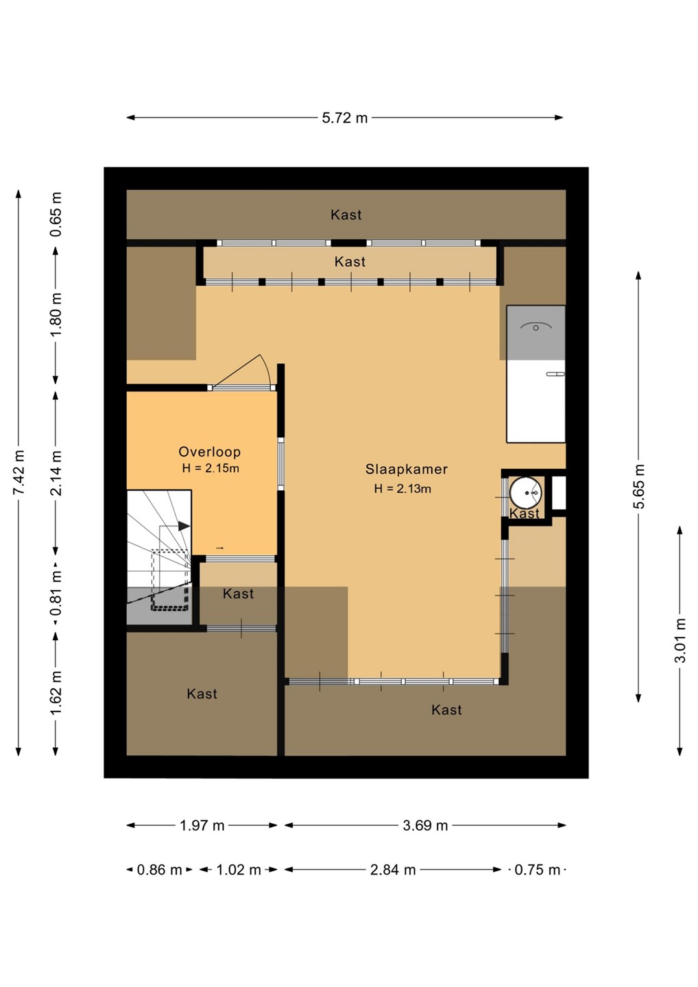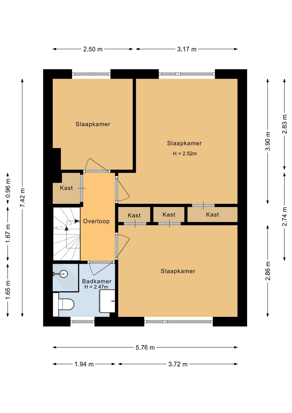 Eerste verdieping De eerste verdieping is praktisch ingedeeld. De overloop biedt toegang tot een gangkast en drie lichte en sfeervolle slaapkamers, waarvan twee ruime slaapkamers beschikken over handige ingebouwde kastruimte die zorgen voor extra bergruimte. De derde, kleinere kamer aan de achterzijde leent zich uitstekend als kinderslaapkamer, thuiswerkplek, hobbyruimte of kleedkamer.