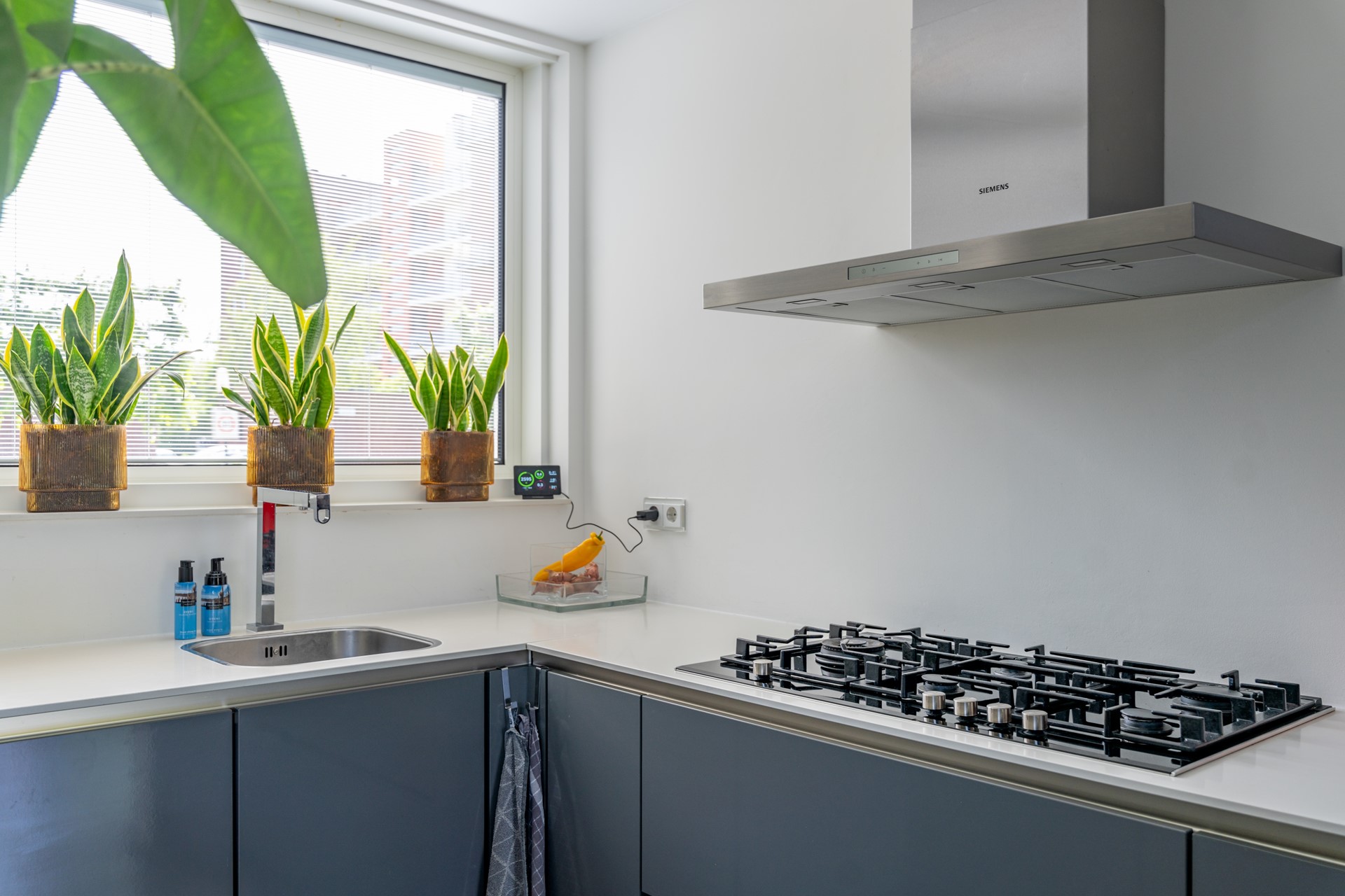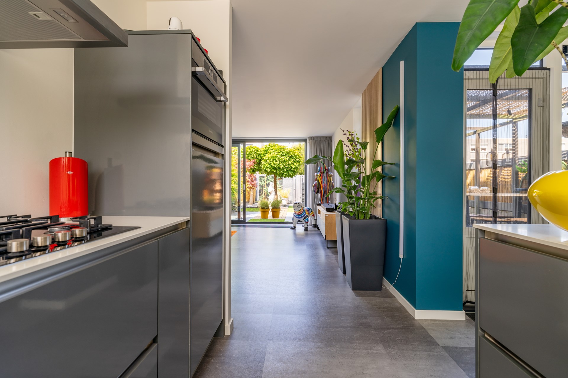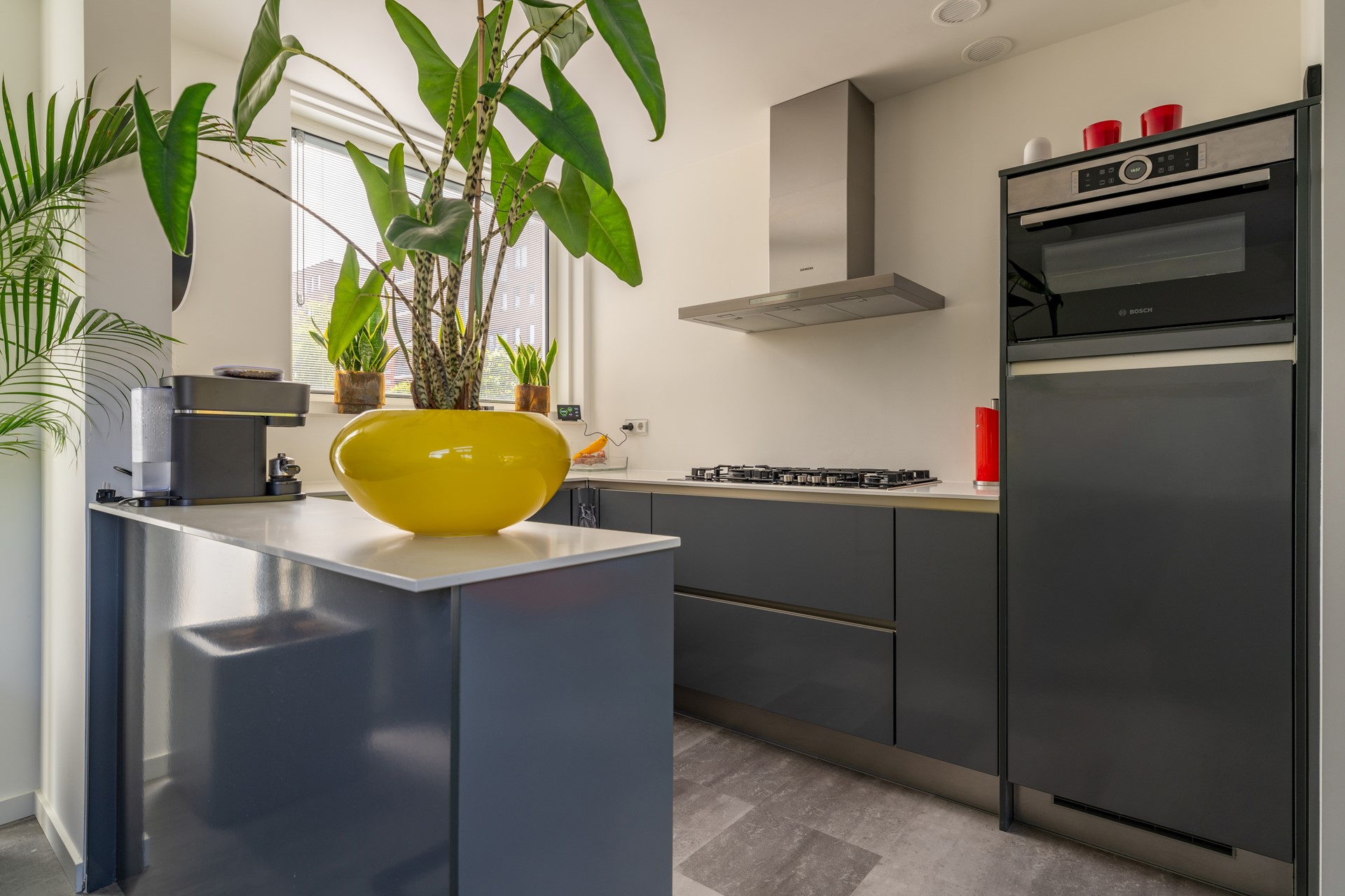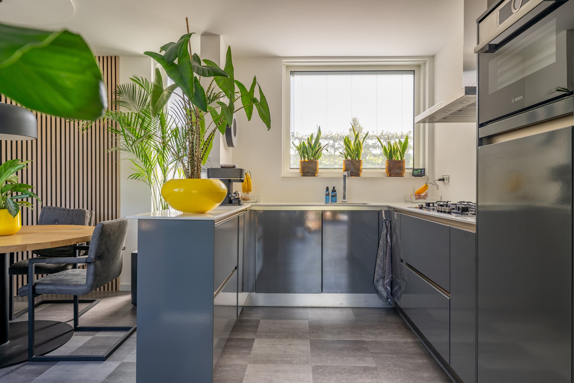 Ruime entreehal met meterkast, trapopgang en moderne toiletruimte met fonteintje. Vanuit de hal bereikt u de lichte, tuingerichte woonkamer met trapkast en een brede schuifpui naar de tuin, waardoor binnen en buiten naadloos in elkaar overlopen. De moderne woonkeuken in U-opstelling is voorzien van hoogwaardige Bosch inbouwapparatuur: een combi-oven, vaatwasser, koelkast, 5-pits gaskookplaat met wokbrander en een RVS afzuigschouw. De gehele begane grond is afgewerkt met een fraaie laminaatvloer en convectorradiator, wat bijdraagt aan een strak en sfeervol geheel.