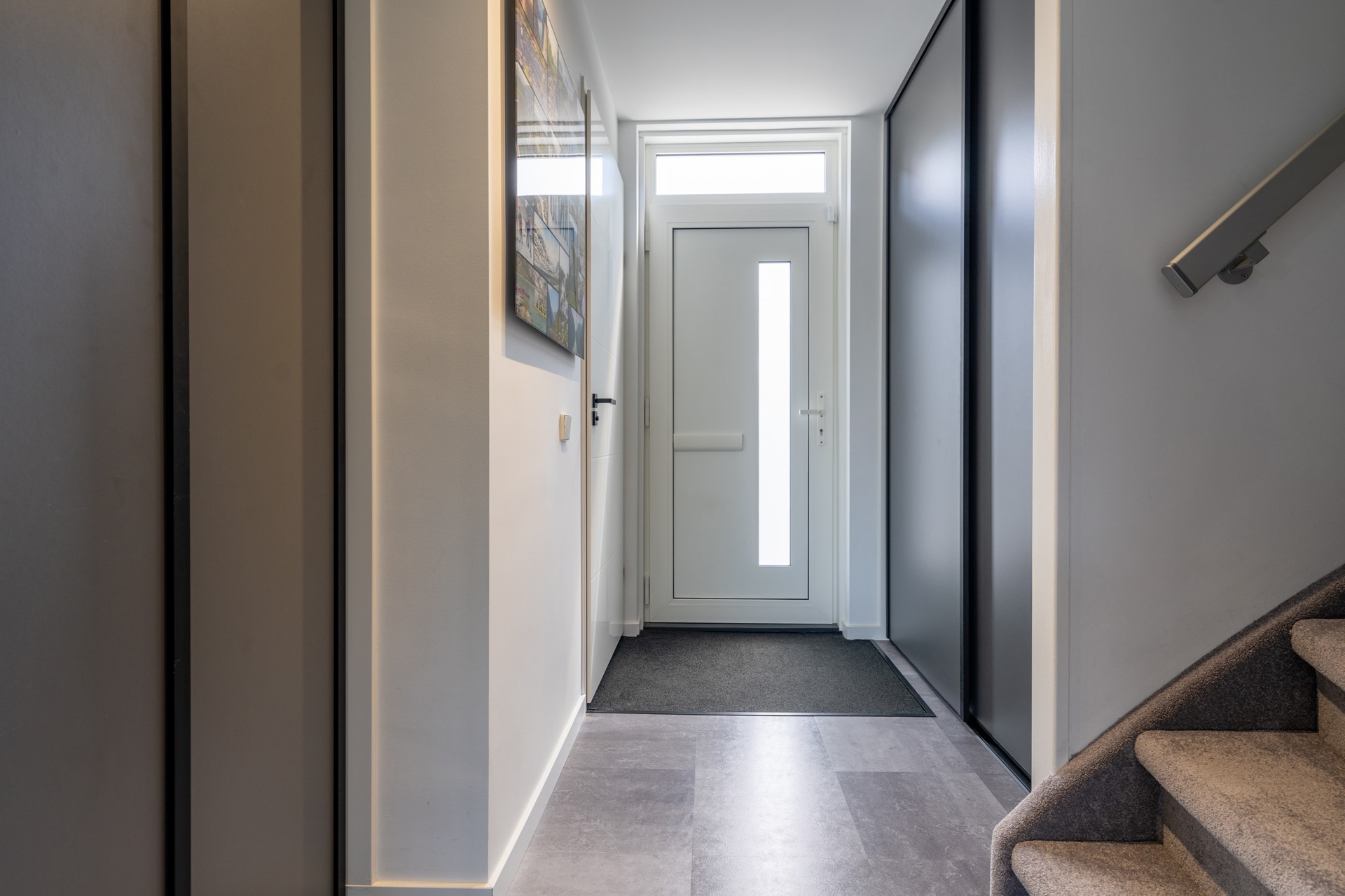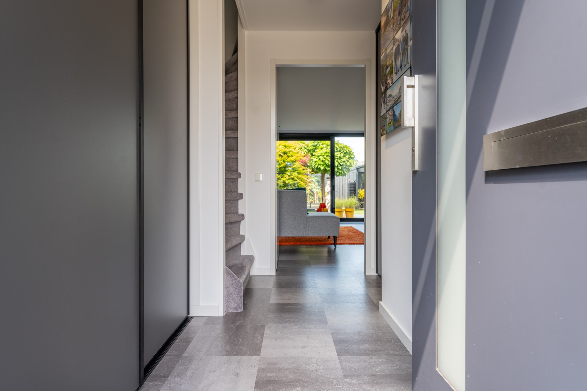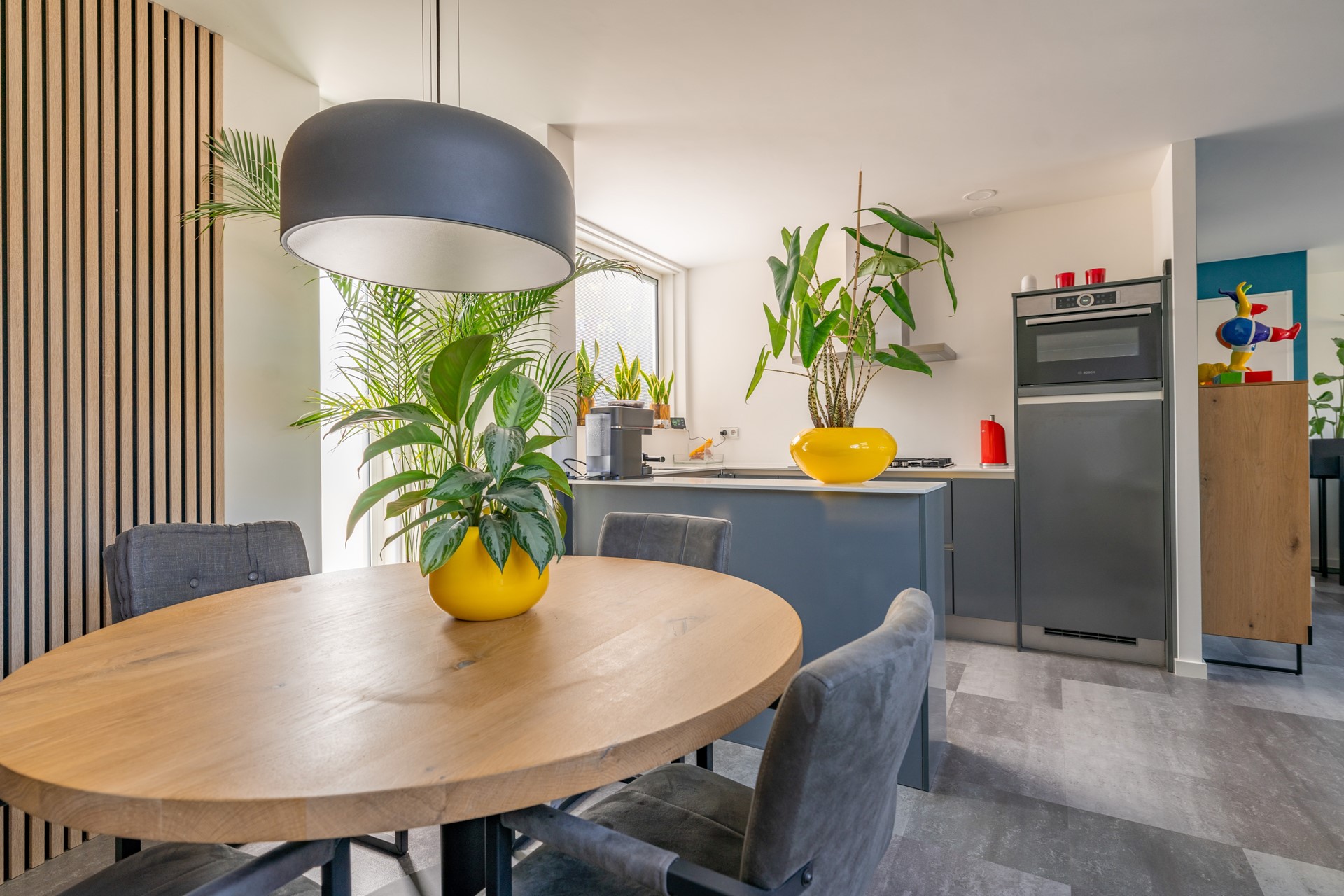Ruime entreehal met meterkast, trapopgang en moderne toiletruimte met fonteintje. Vanuit de hal bereikt u de lichte, tuingerichte woonkamer met trapkast en een brede schuifpui naar de tuin, waardoor binnen en buiten naadloos in elkaar overlopen. De moderne woonkeuken in U-opstelling is voorzien van hoogwaardige Bosch inbouwapparatuur: een combi-oven, vaatwasser, koelkast, 5-pits gaskookplaat met wokbrander en een RVS afzuigschouw. De gehele begane grond is afgewerkt met een fraaie laminaatvloer en convectorradiator, wat bijdraagt aan een strak en sfeervol geheel.