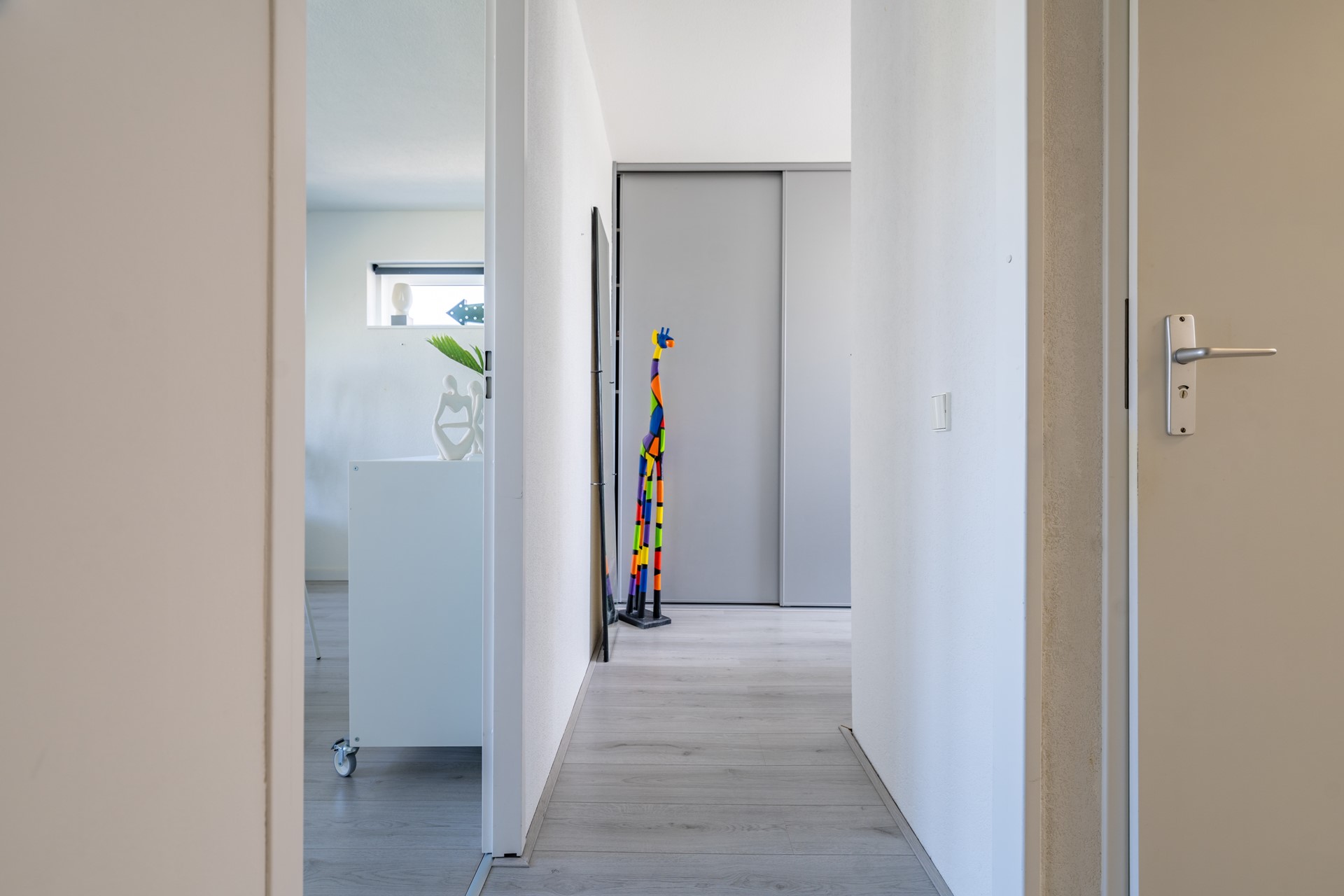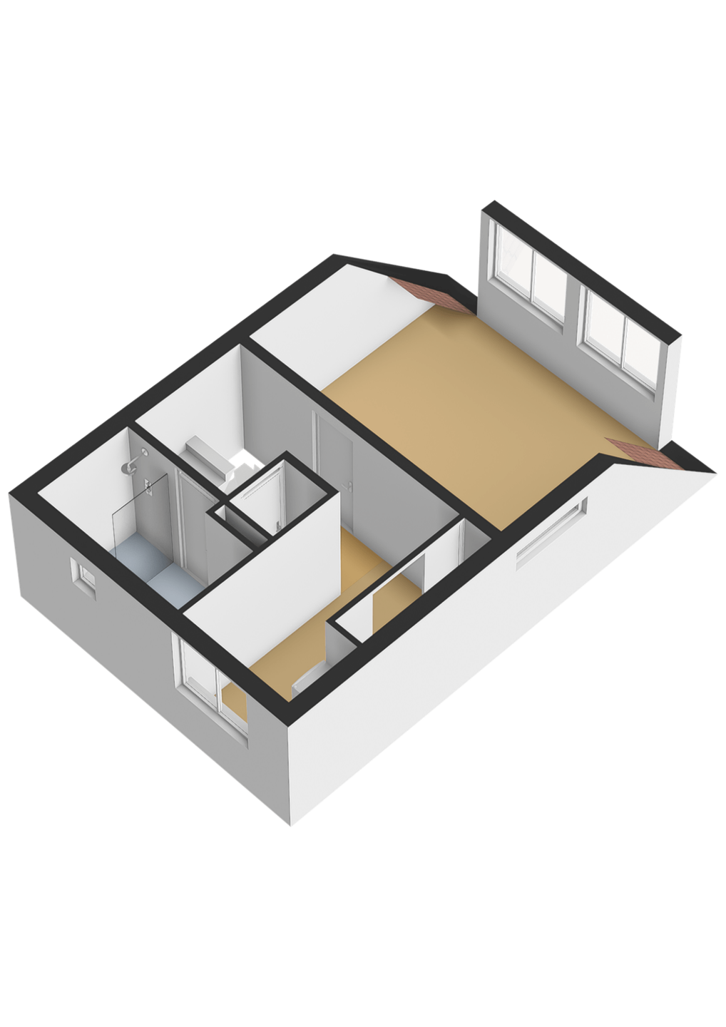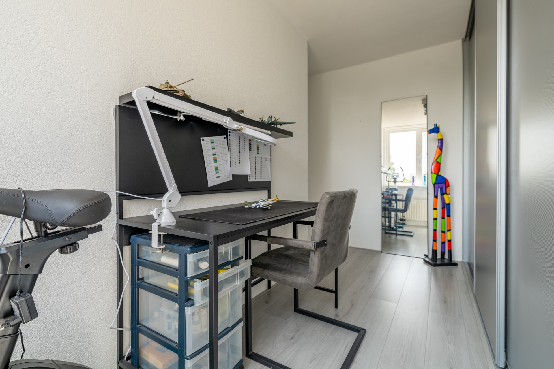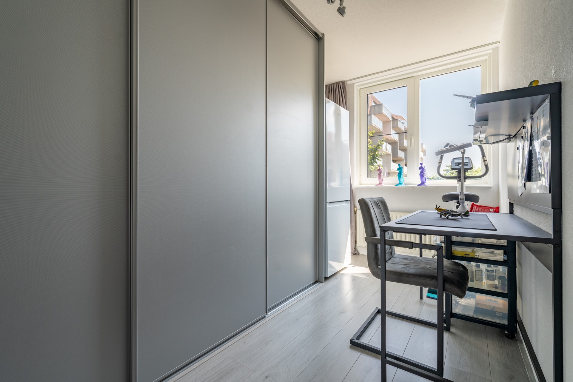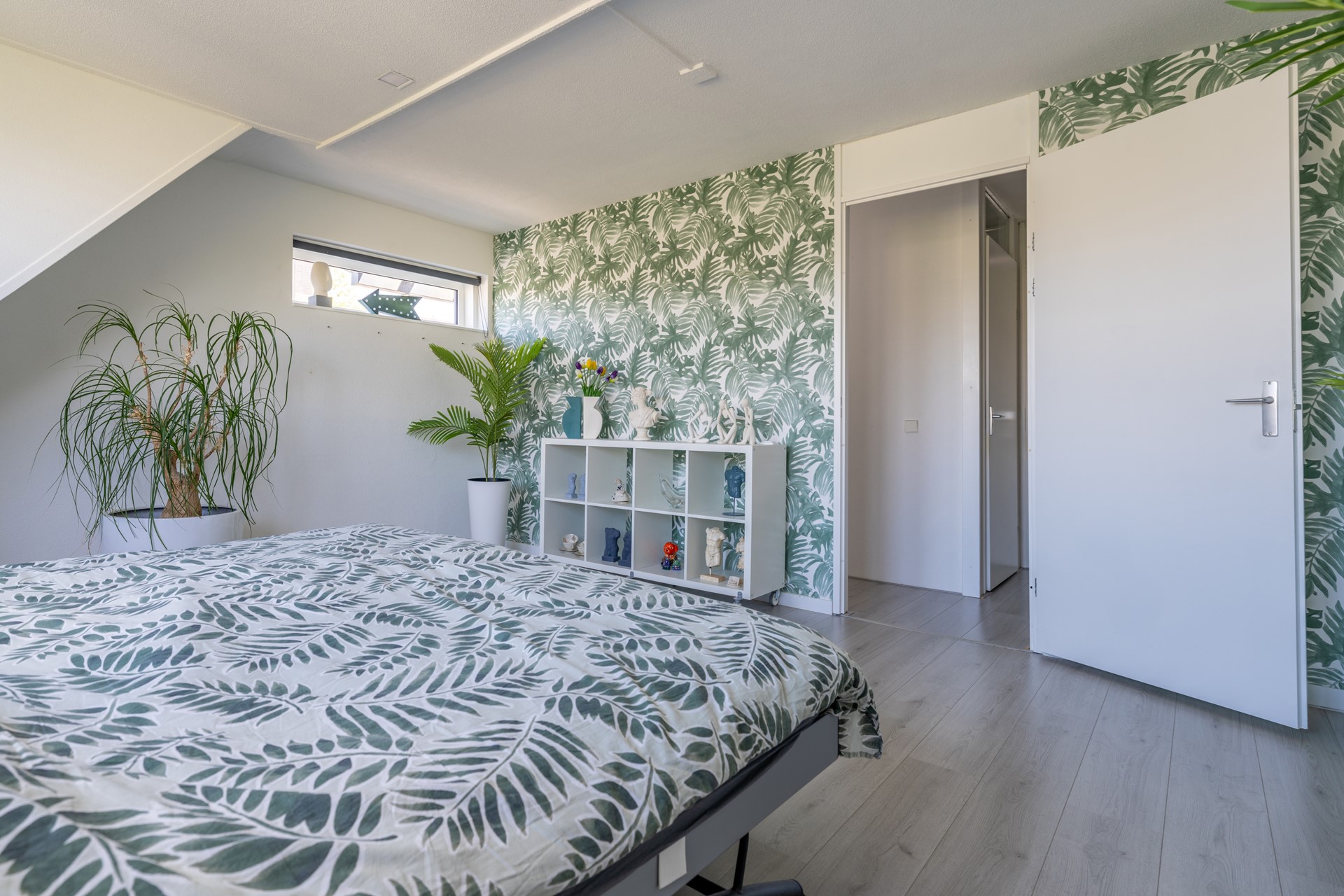 Overloop met toegang tot een ruime, woningbrede ouderslaapkamer aan de achterzijde met dakkapel en kunststof kozijnen. Aan de voorzijde een tweede slaapkamer, momenteel in gebruik als kastenkamer met werkplek. De moderne badkamer beschikt over een inloopdouche, wastafelmeubel met grote lades en een handdoekradiator. Separaat bevindt zich een tweede toiletruimte. Ook deze verdieping is netjes afgewerkt met een laminaatvloer.