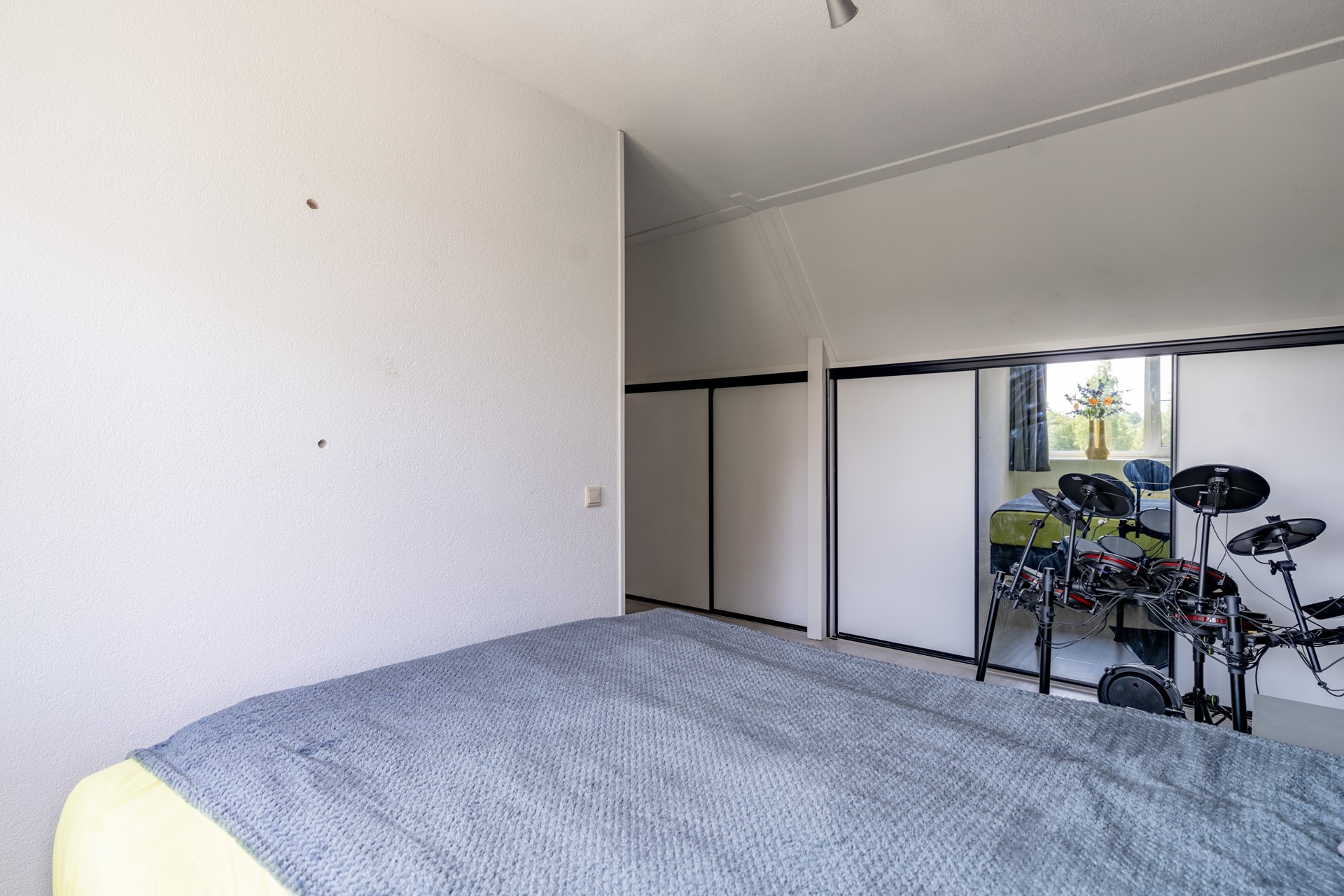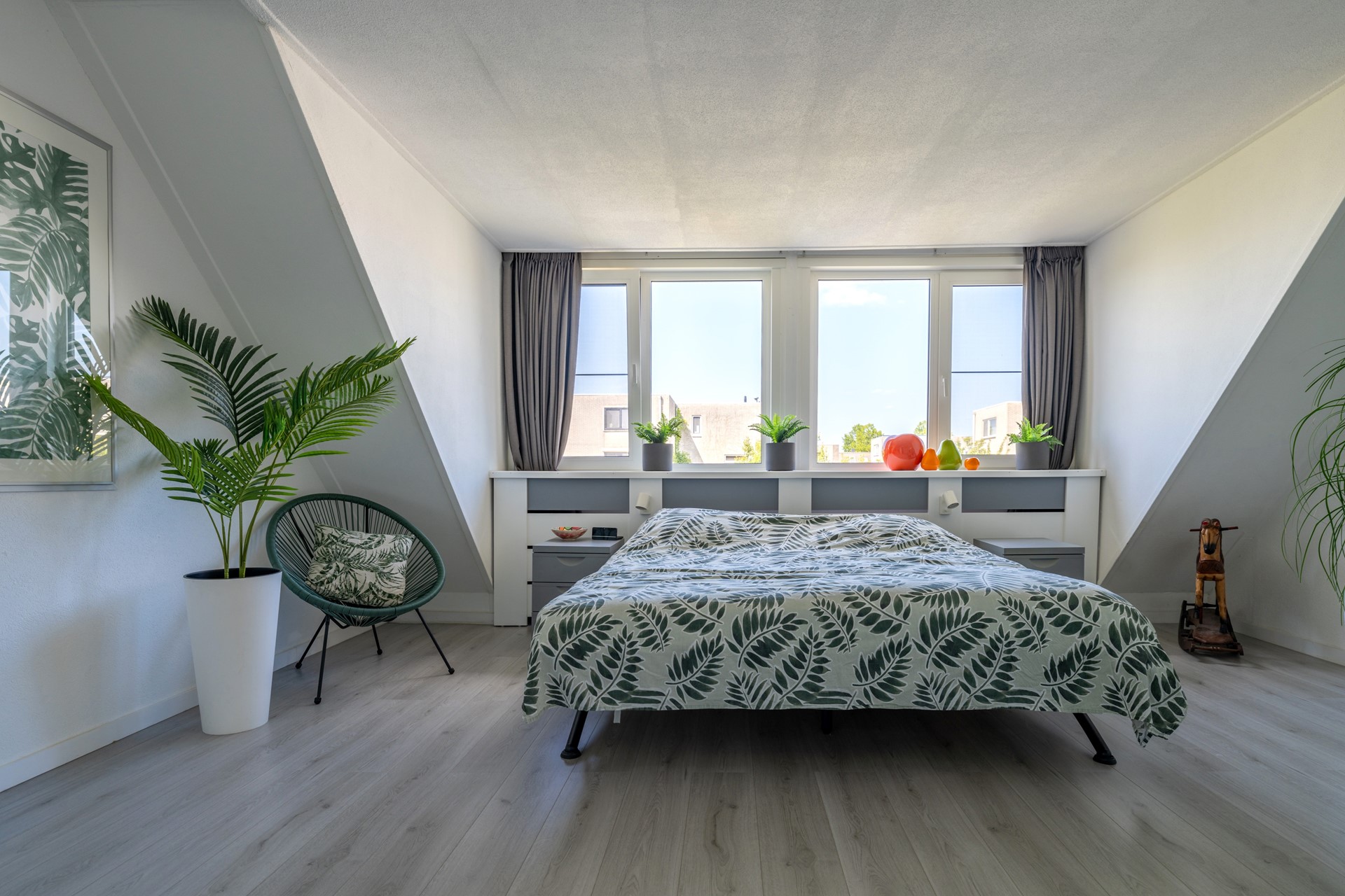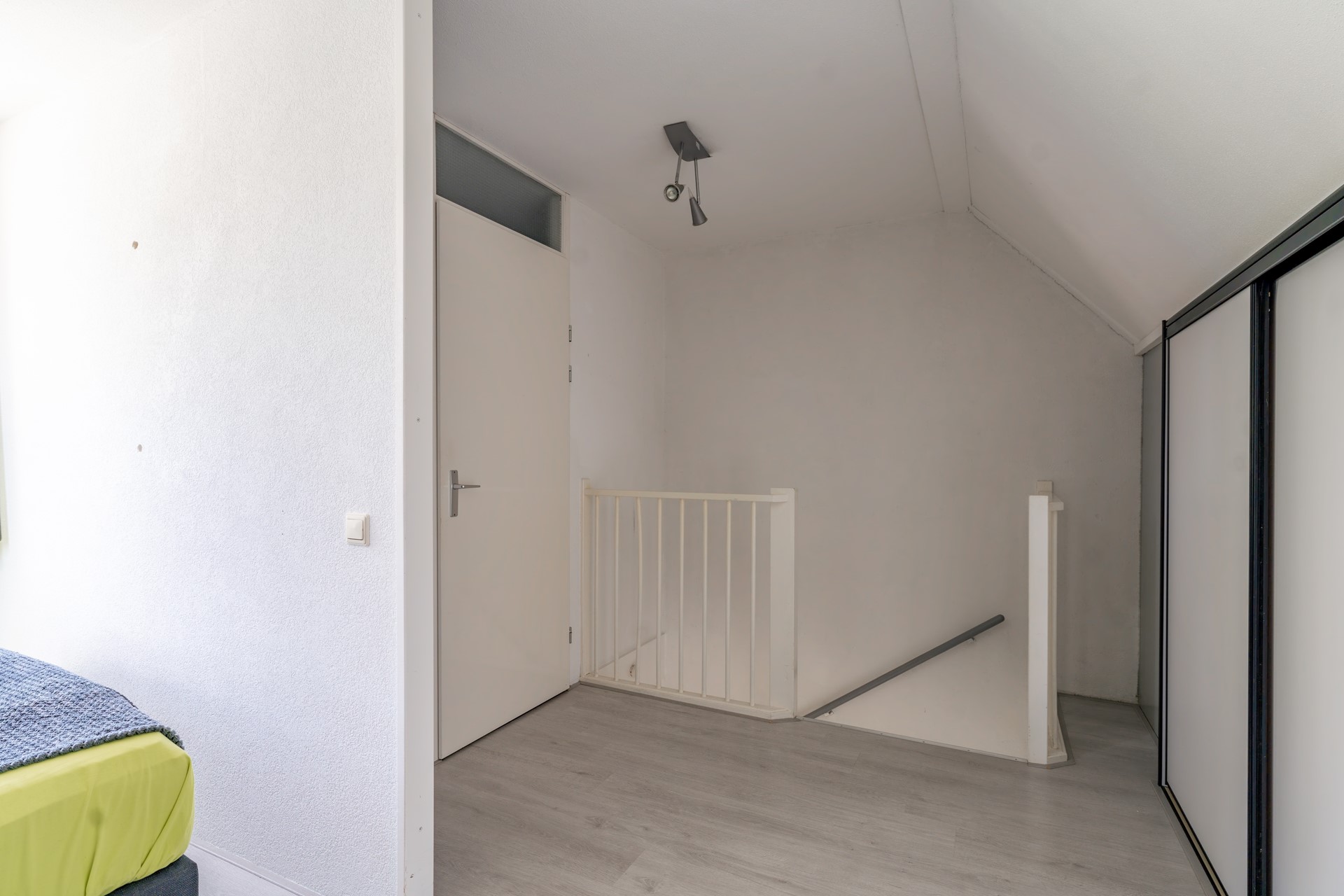 Ruime overloop met toegang tot een praktische wasruimte met opstelplaats voor wasmachine en droger, veel bergruimte en de Remeha cv-ketel (2012). Aan de voorzijde ligt een royale slaapkamer met ramen aan zowel de voorzijde als zijkant, wat zorgt voor veel natuurlijk licht.