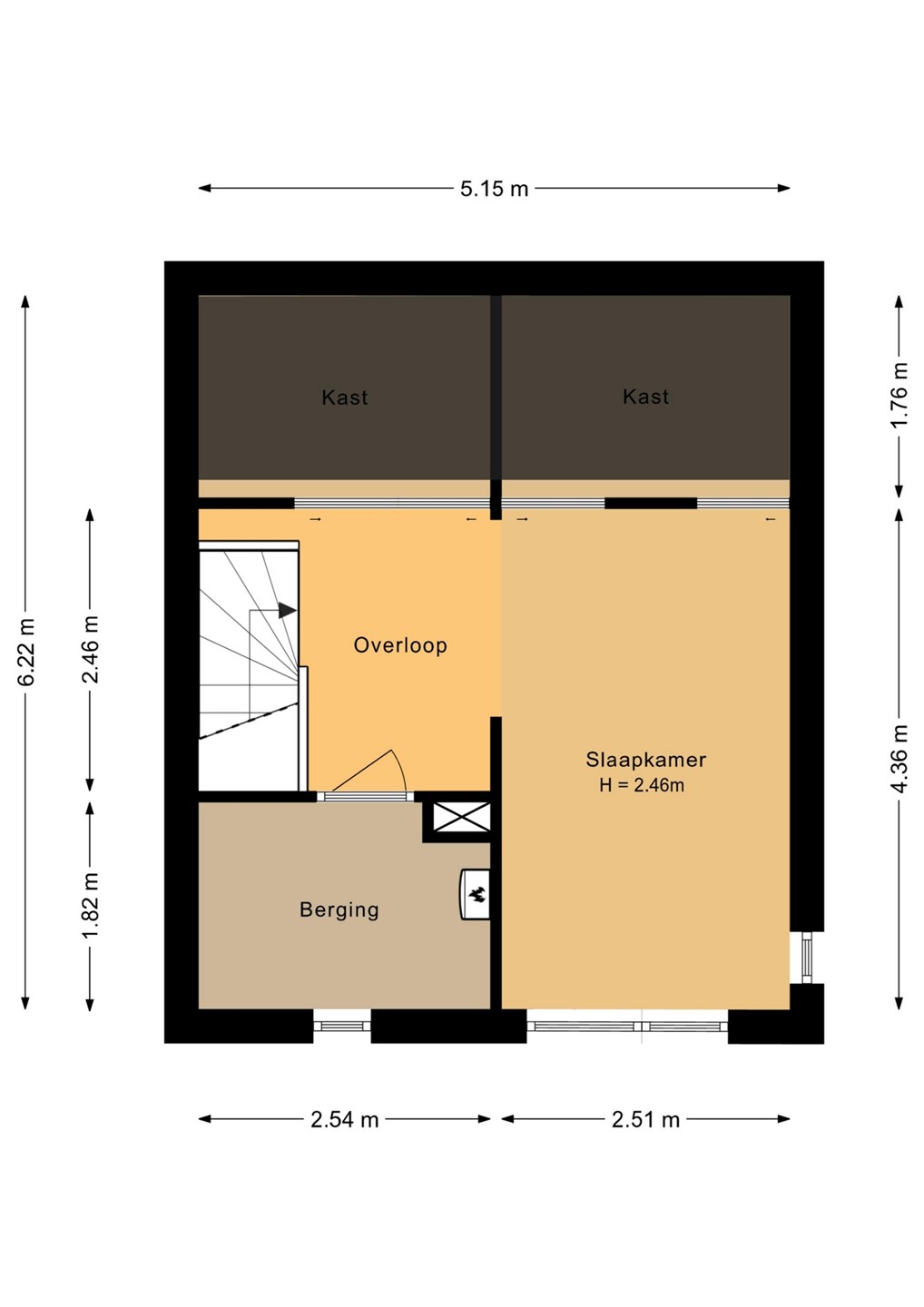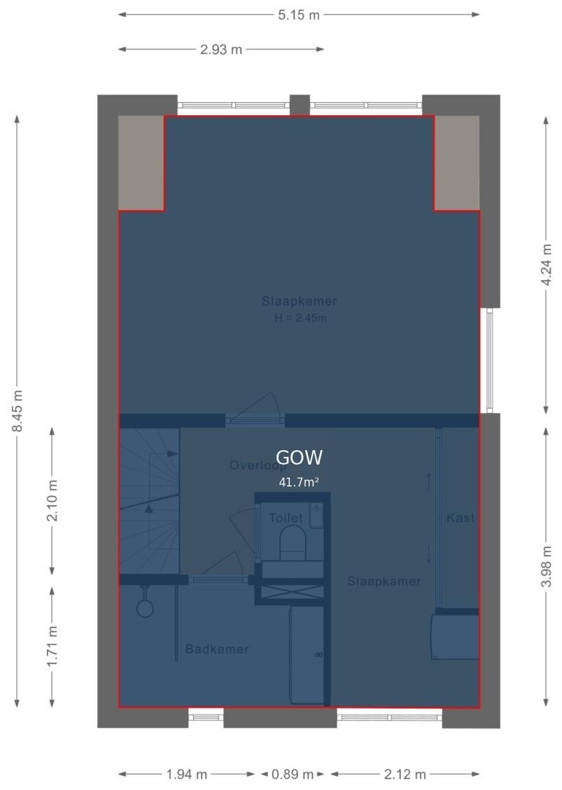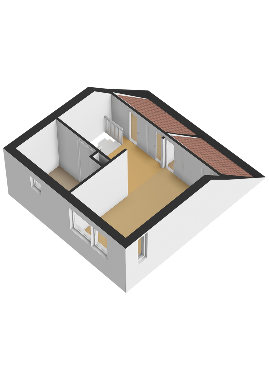 Ruime overloop met toegang tot een praktische wasruimte met opstelplaats voor wasmachine en droger, veel bergruimte en de Remeha cv-ketel (2012). Aan de voorzijde ligt een royale slaapkamer met ramen aan zowel de voorzijde als zijkant, wat zorgt voor veel natuurlijk licht.